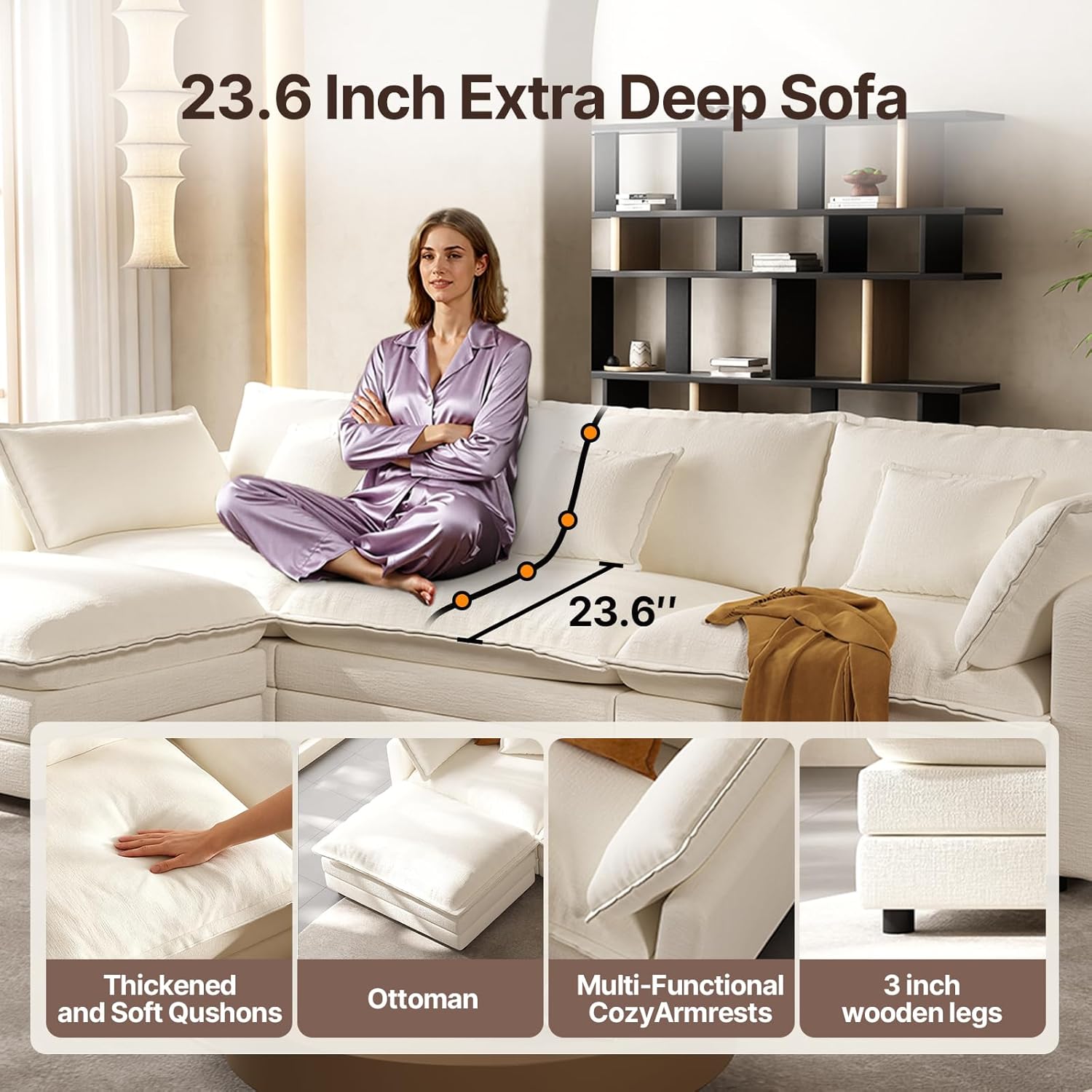 [Spacious & Ultra-Comfy Seating]: Featuring an extra-wide 32″ seat and extra-deep 23.6″ design, this soft cloud modular sofa provides plenty of space to stretch out and relax. The soft waist pillow offers excellent lower back support, while the thick cushioned seat ensures long-lasting comfort, so you can lounge for hours without discomfort. Designed with an ergonomic seat angle, this sofa helps relieve daily fatigue—perfect for entertaining, napping, or unwinding after a long day.