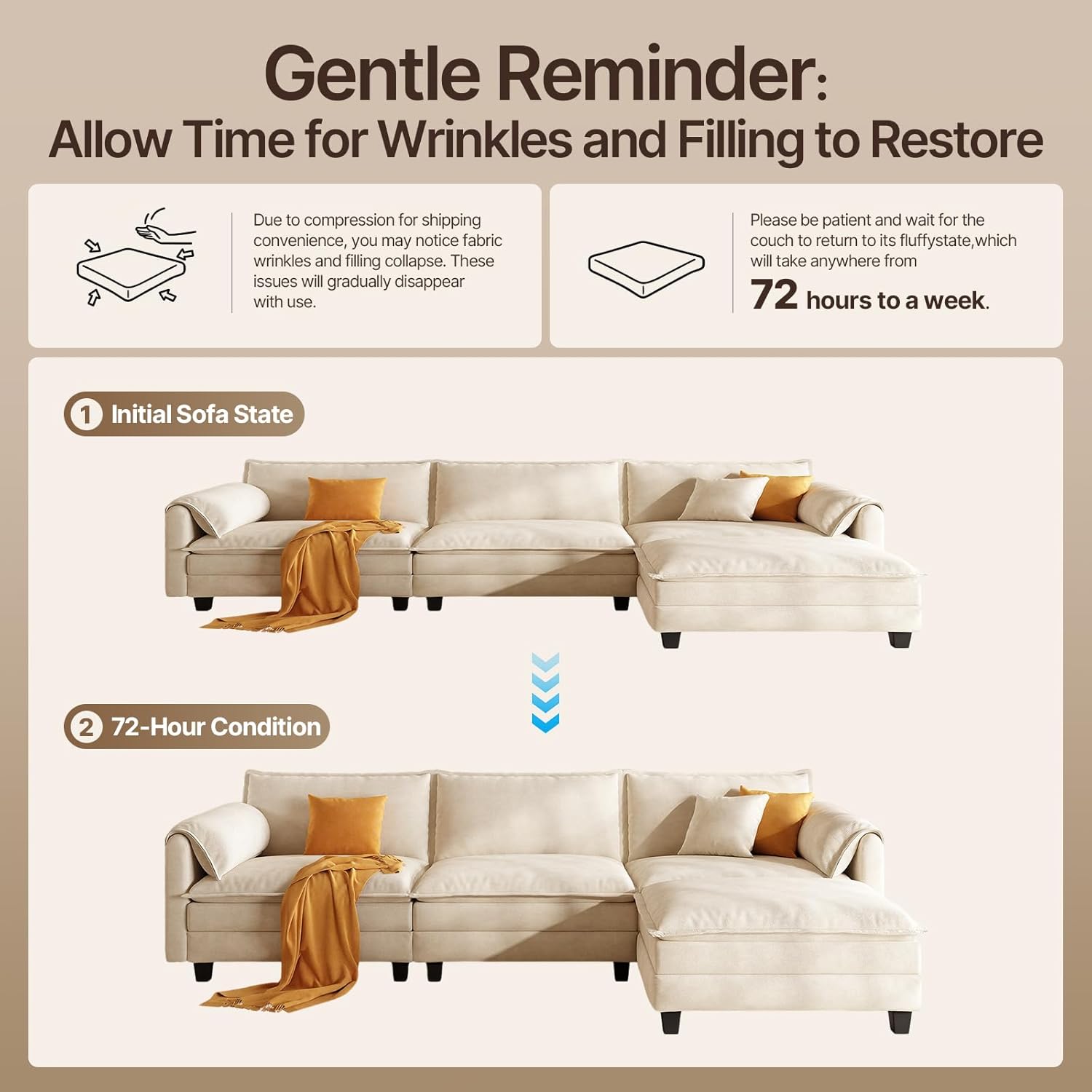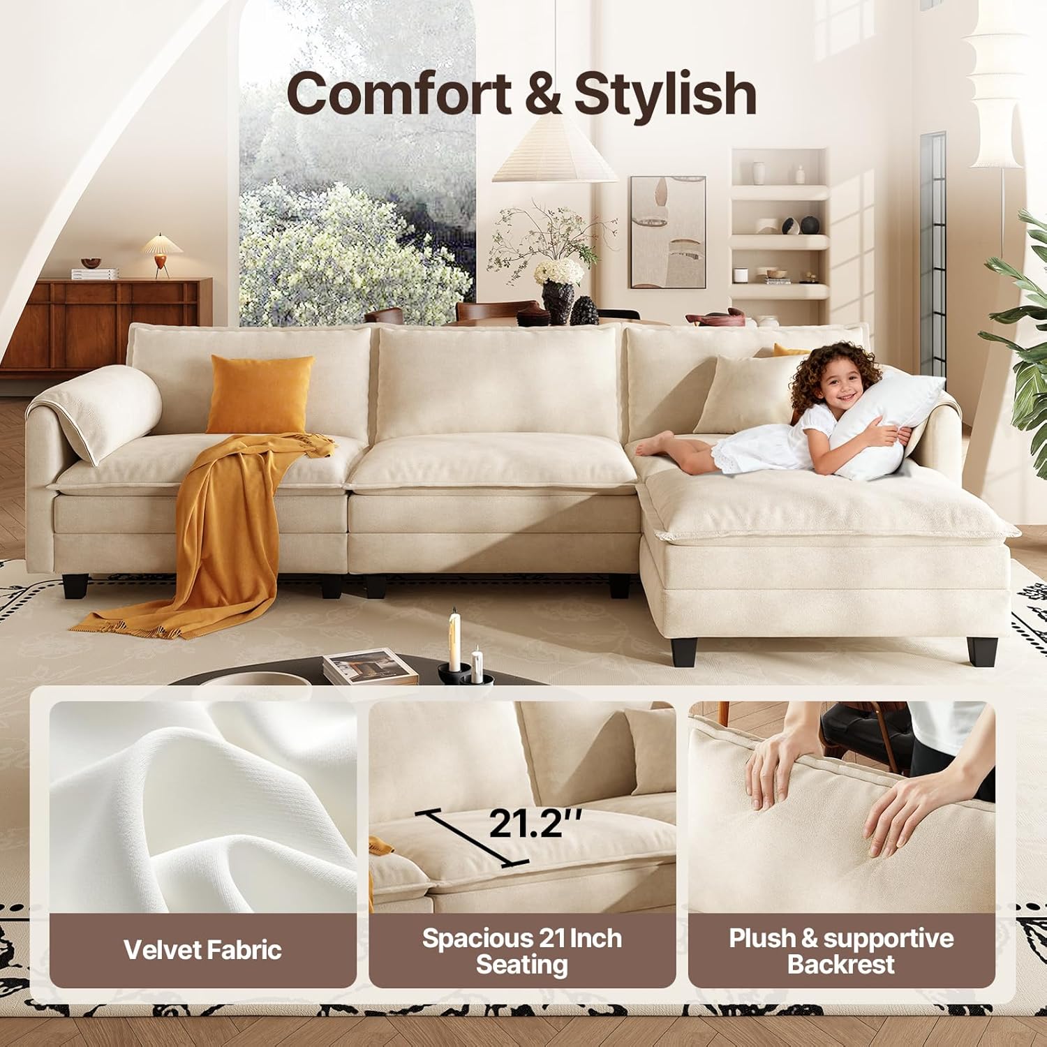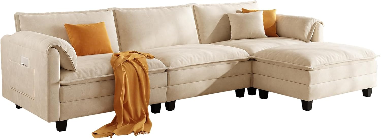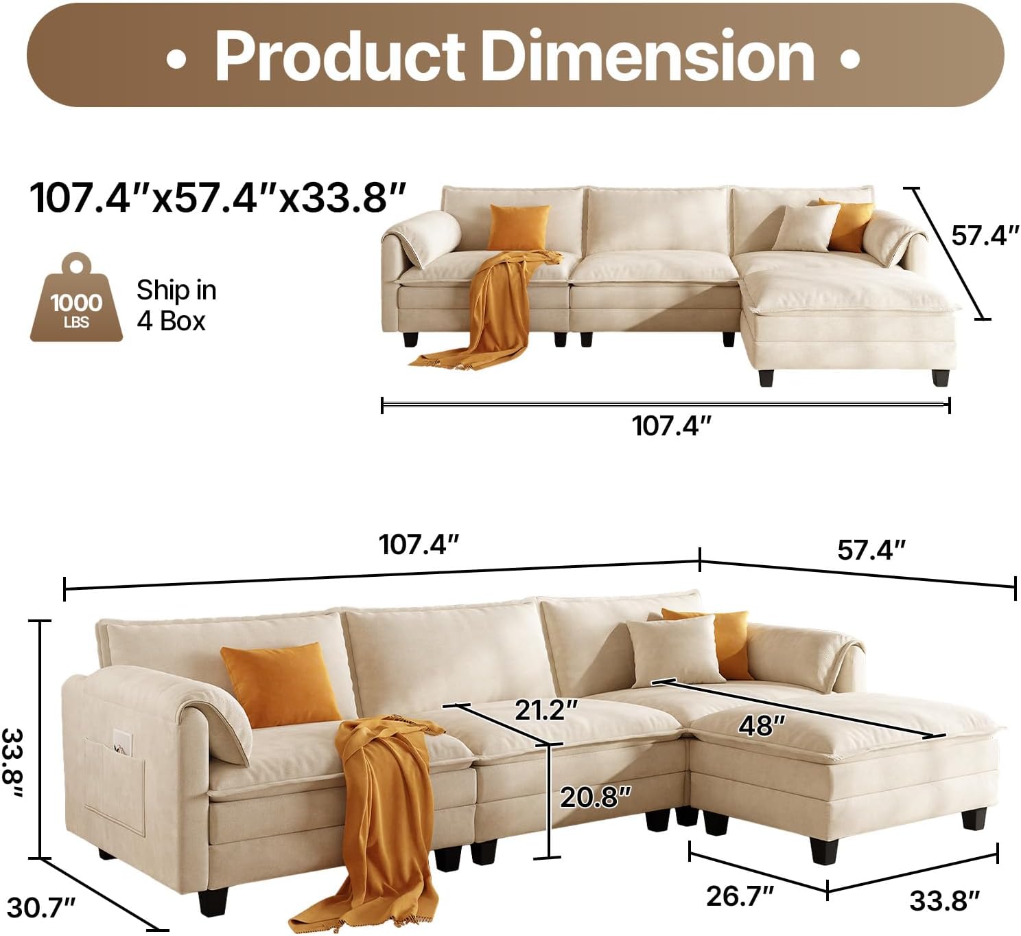 107″ L Shaped Modular Sectional Cloud Couch with Pillow, Deep Seat Sofa Couches for Living Room, 4-Seat Modern Sofa with Movable Ottoman, Comfortable Living Room Couch (Beige, 107 Inch-L)