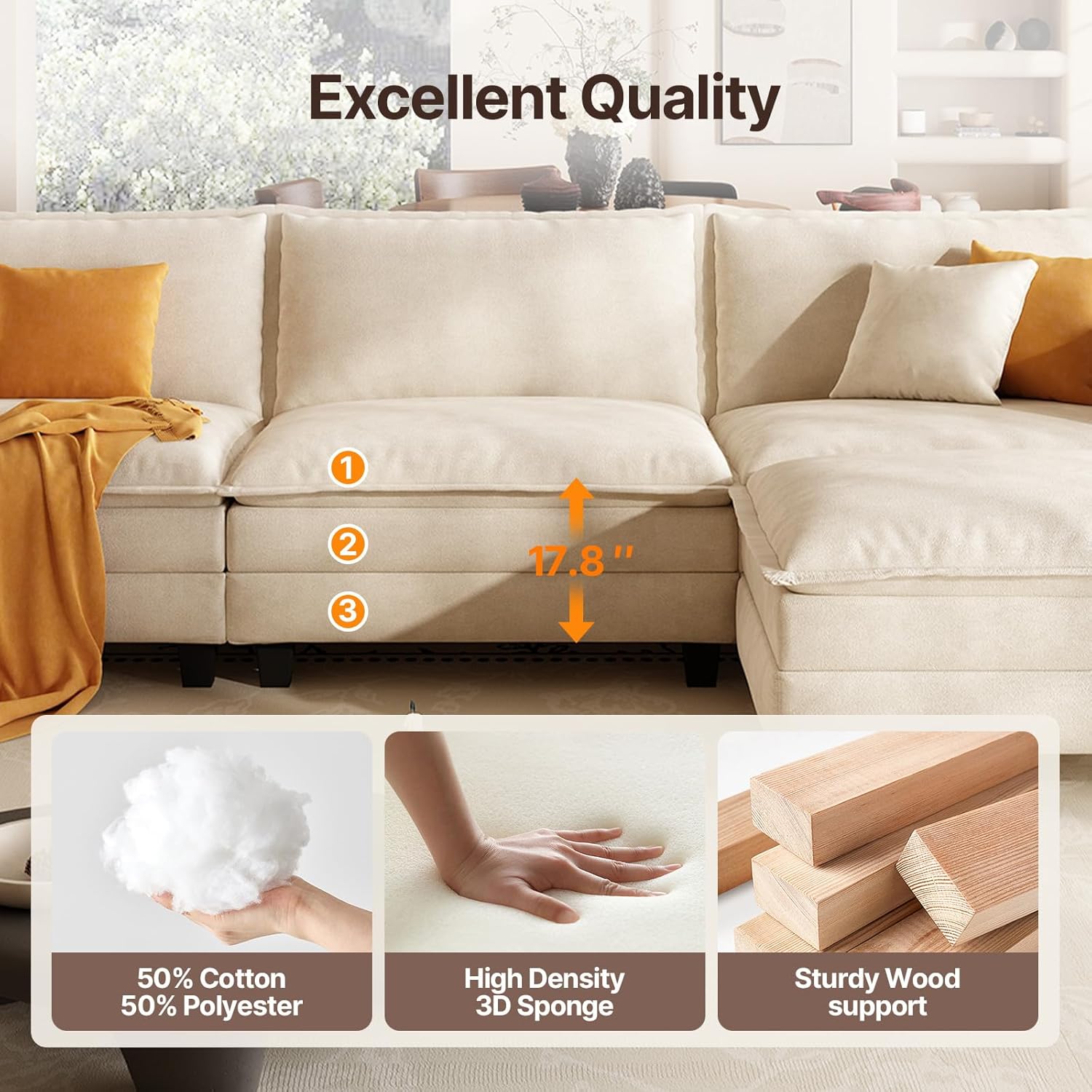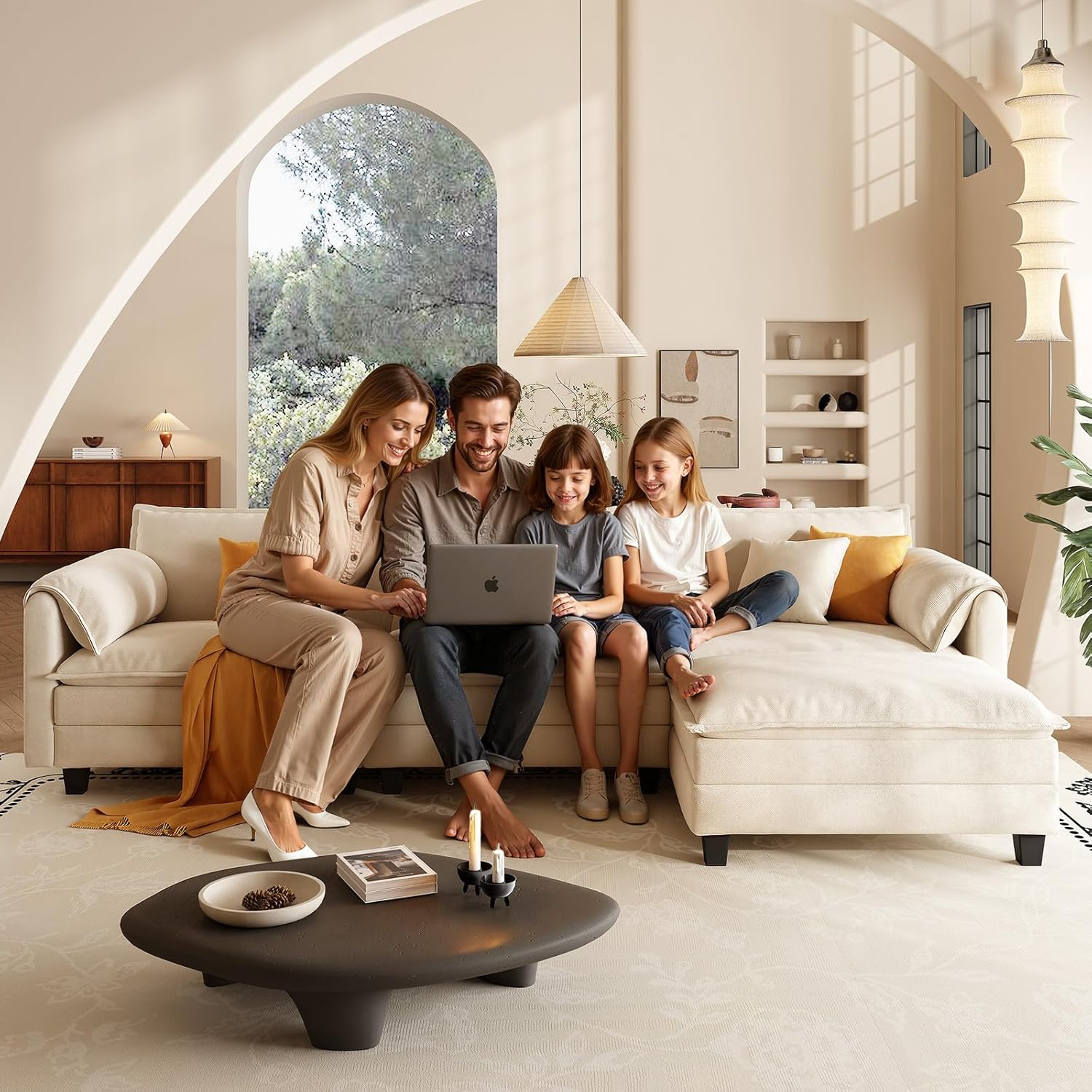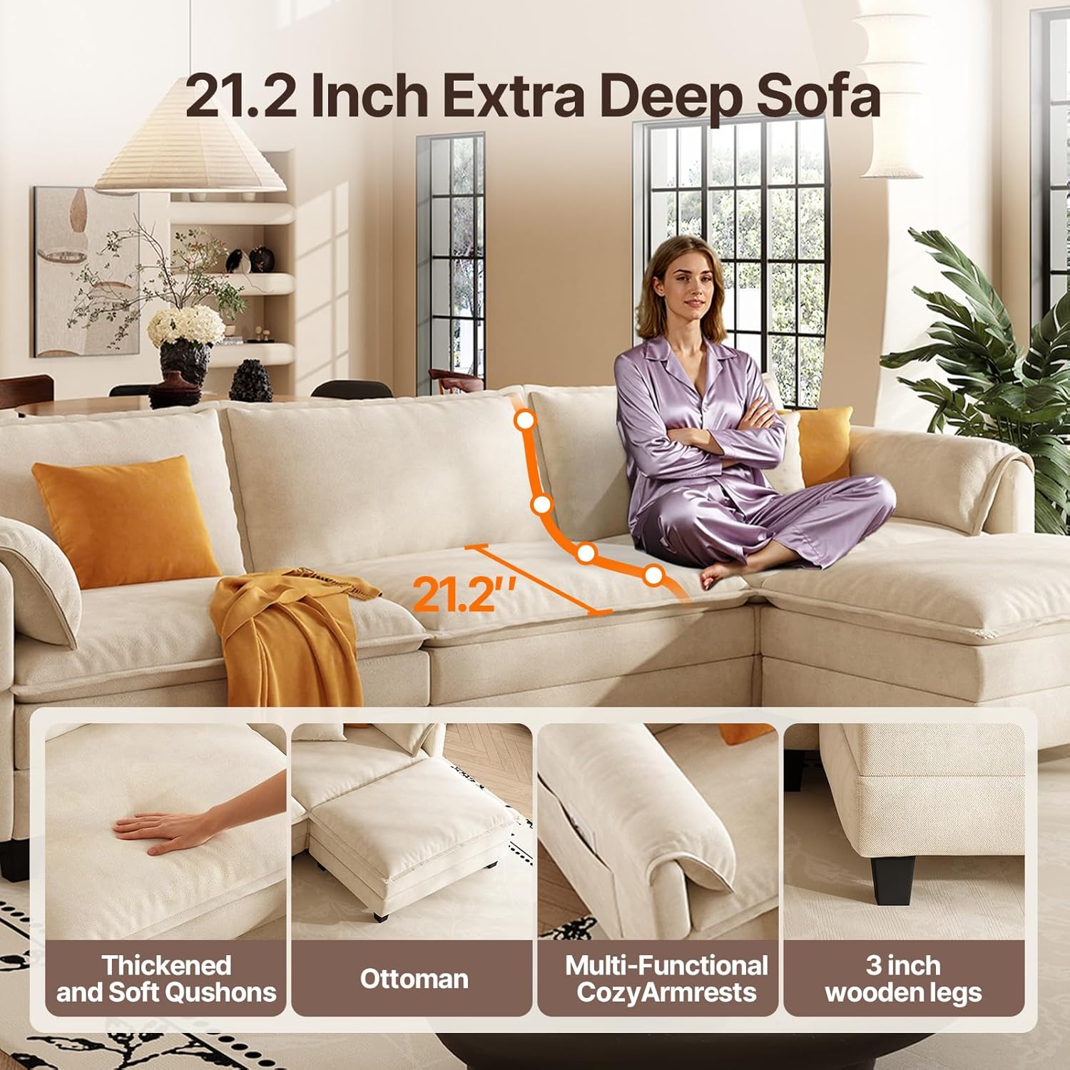 107″ L Shaped Modular Sectional Cloud Couch with Pillow, Deep Seat Sofa Couches for Living Room, 4-Seat Modern Sofa with Movable Ottoman, Comfortable Living Room Couch (Beige, 107 Inch-L)