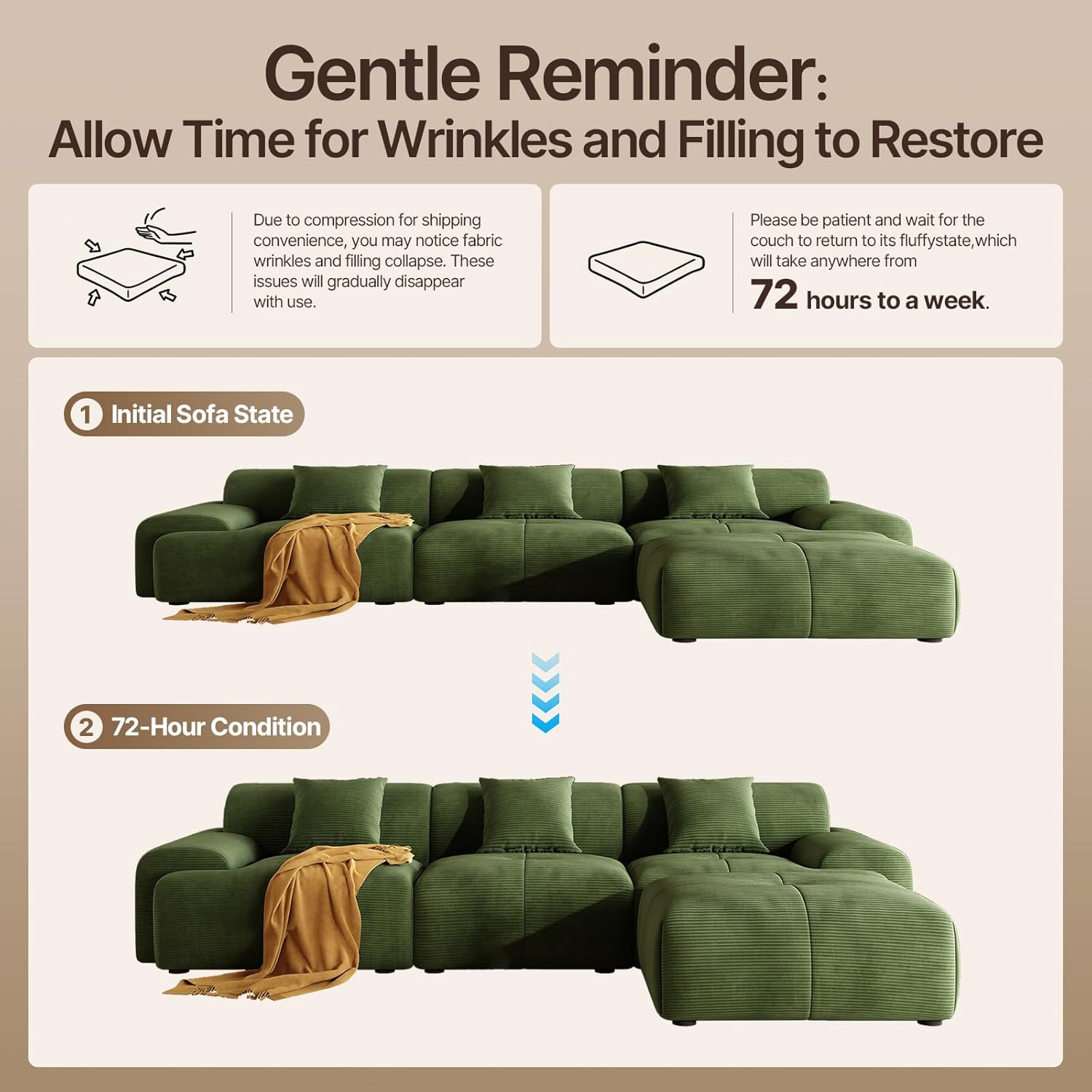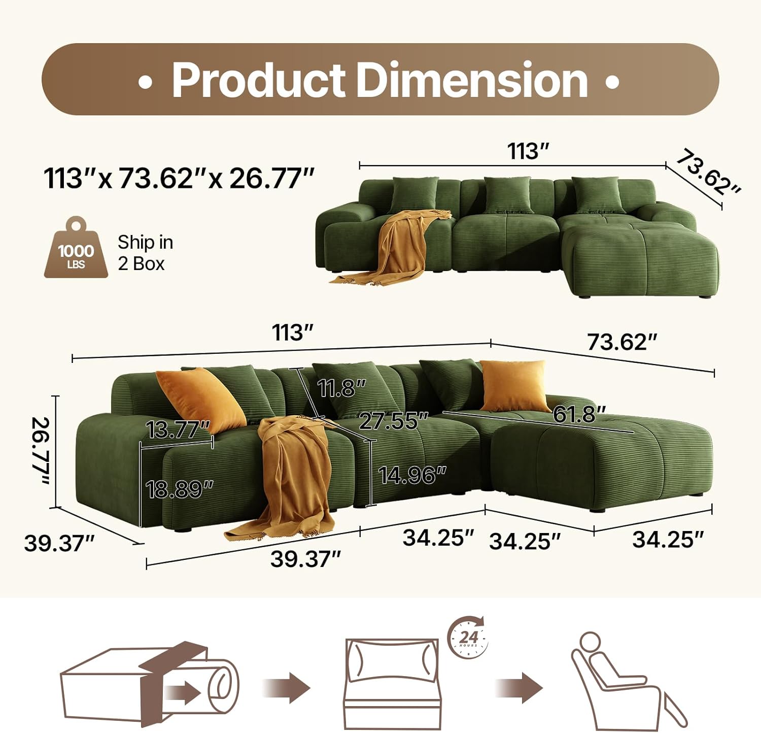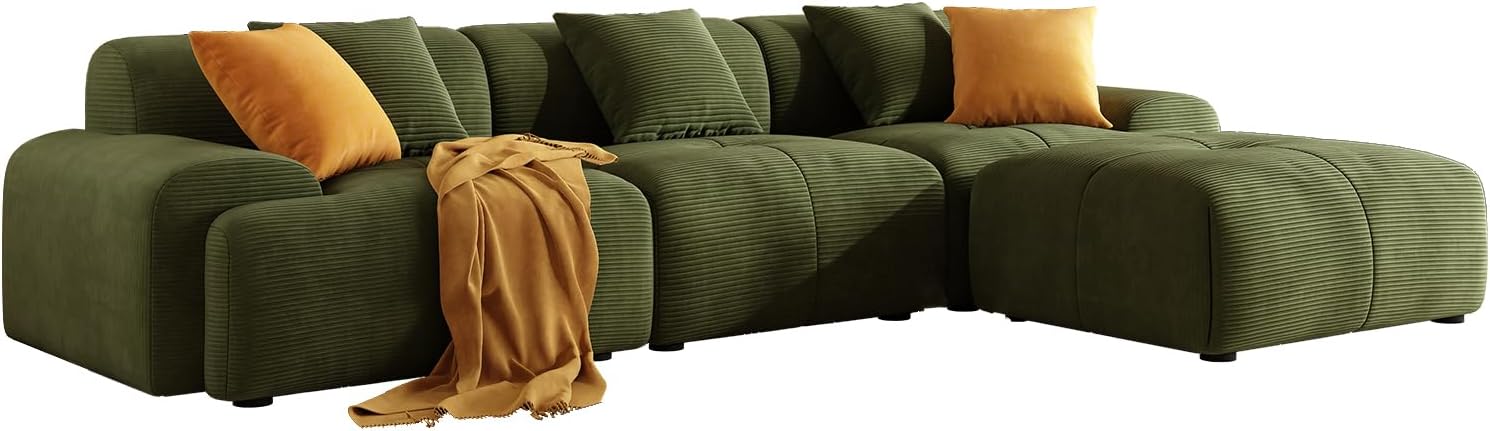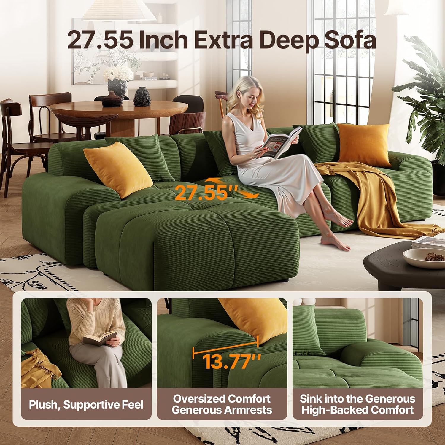 113″ Modern L-Shaped Modular Sectional Sofa for Living Room, Corduroy Upholstery Green, 3-Seater Cloud Couchand Movable Ottoman – No Assembly Green