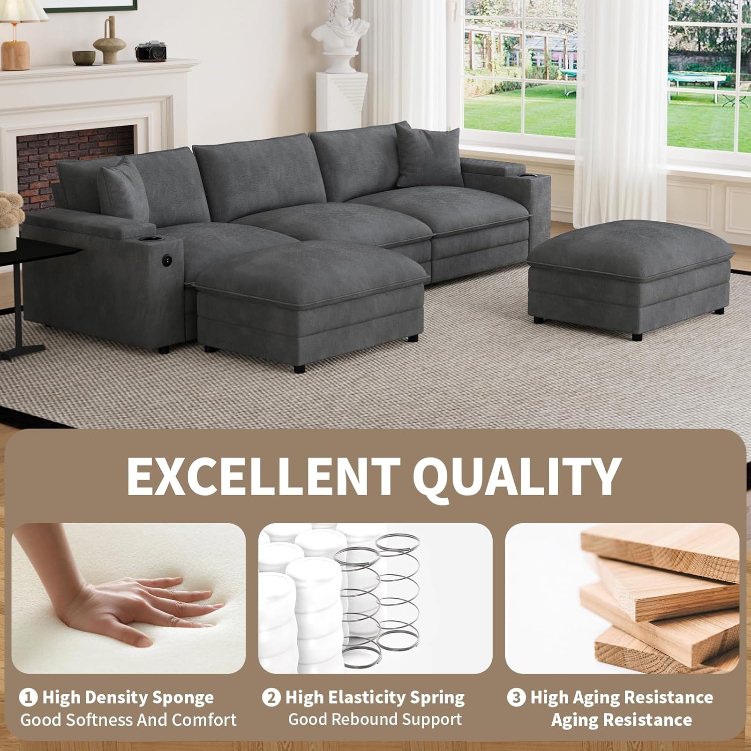 115″ U Shaped Cloud Sofa Couch with Ottoman, Storage Armrest, Cup Holders, USB & Type-C Ports, Spring Cushions, Solid Wood Frame, Chenille Modular Sectional for Living Room (Dark Gray-U-115.2″)