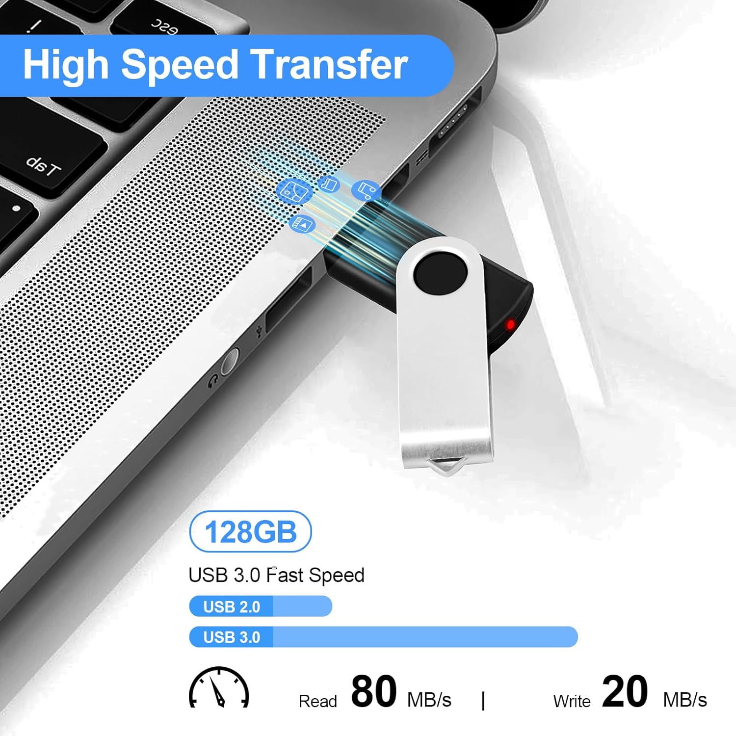 USB 3.0 High Speed Storage: 128GB USB Flash Drive equipped with advanced USB 3.0 technology, thumb drive boasts read speeds of up to 80 MB/s and write speeds of up to 20 MB/s, over 10x faster than traditional USB 2.0 flash drive. Transfer high-definition movies and large files in seconds, eliminating the need for long waits.