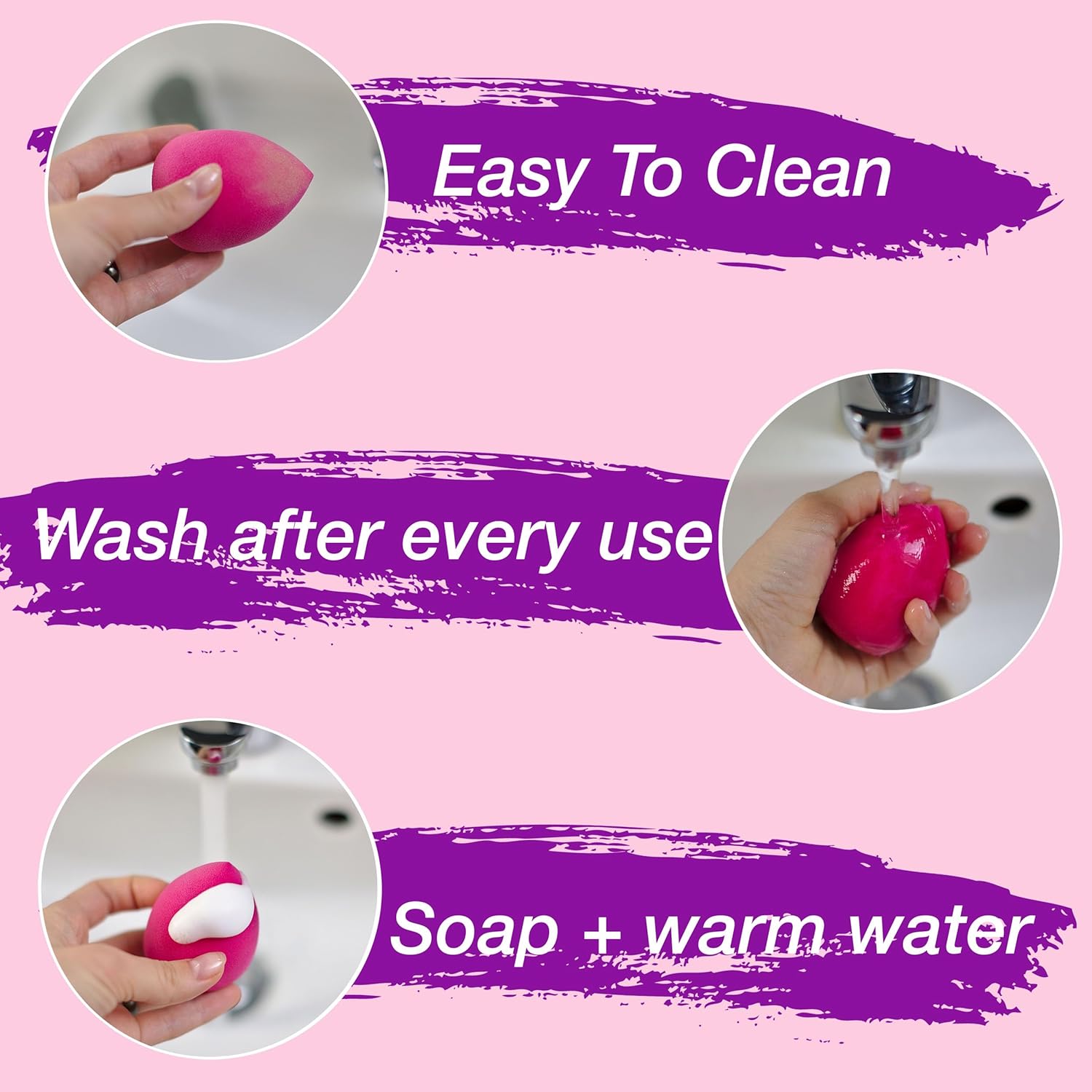 Easy To Clean & Dry – Wash the makeup sponge after every use with mild soap and warm water, and then air dry; regular thorough cleaning of beauty tools and supplies promotes optimal skin health