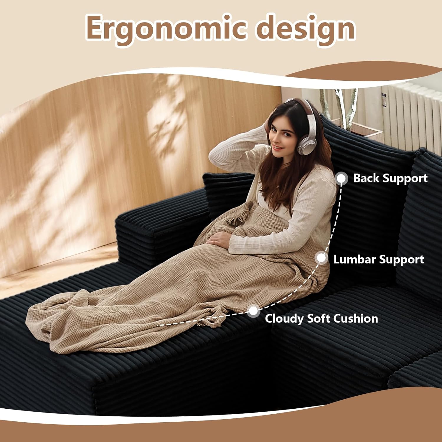 Luxurious Corduroy Upholstery: Experience the comfort and elegance of our high-quality corduroy fabric. Soft, breathable, and durable, this skin-friendly upholstery enhances your seating experience while adding a sophisticated touch to your décor. The boneless sofa includes 4 large cushions and 2 throw pillows for added comfort, ensuring durability and style for years to come. It’s the perfect combination of modern aesthetics and functional comfort, designed to elevate your living space