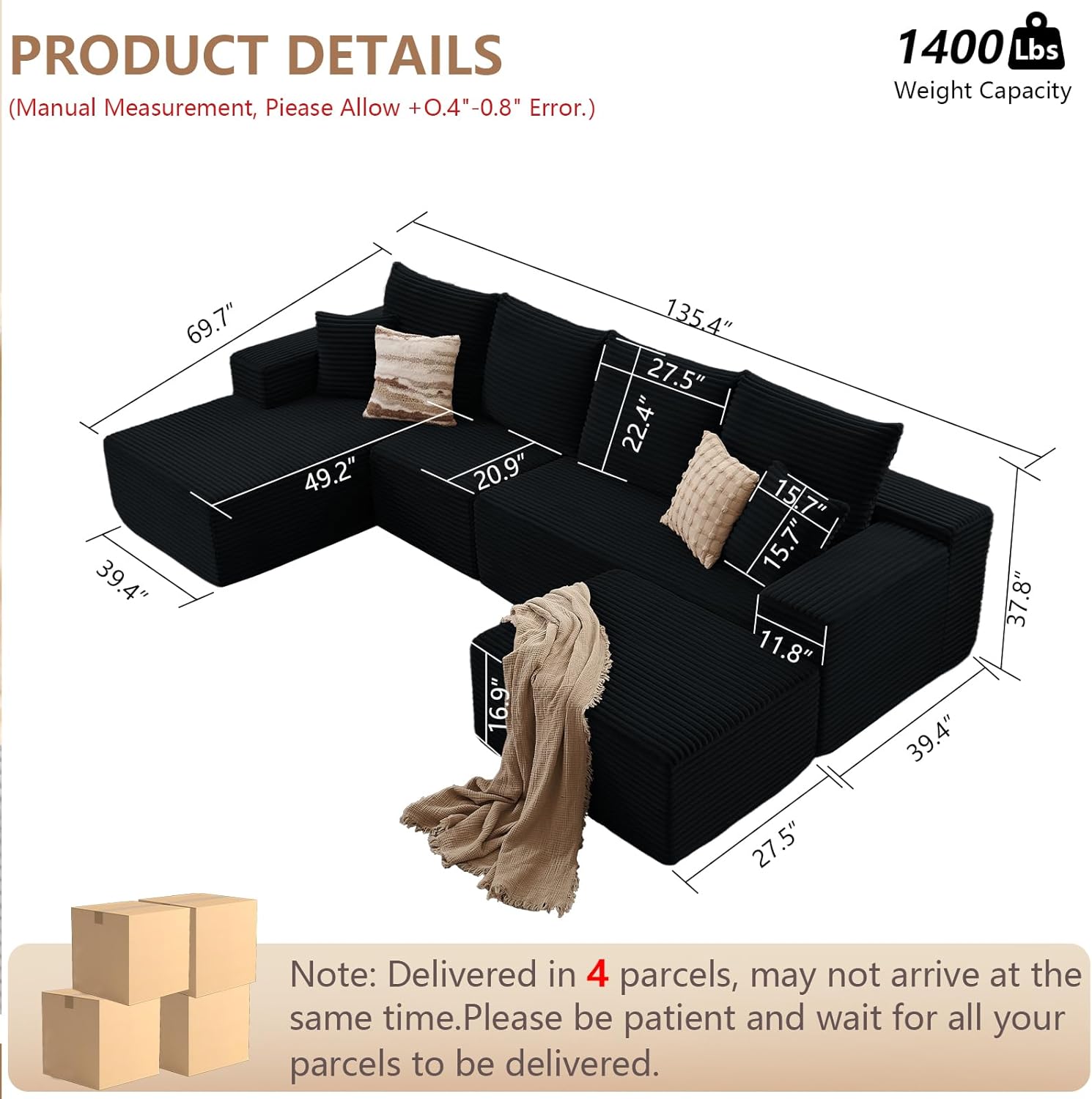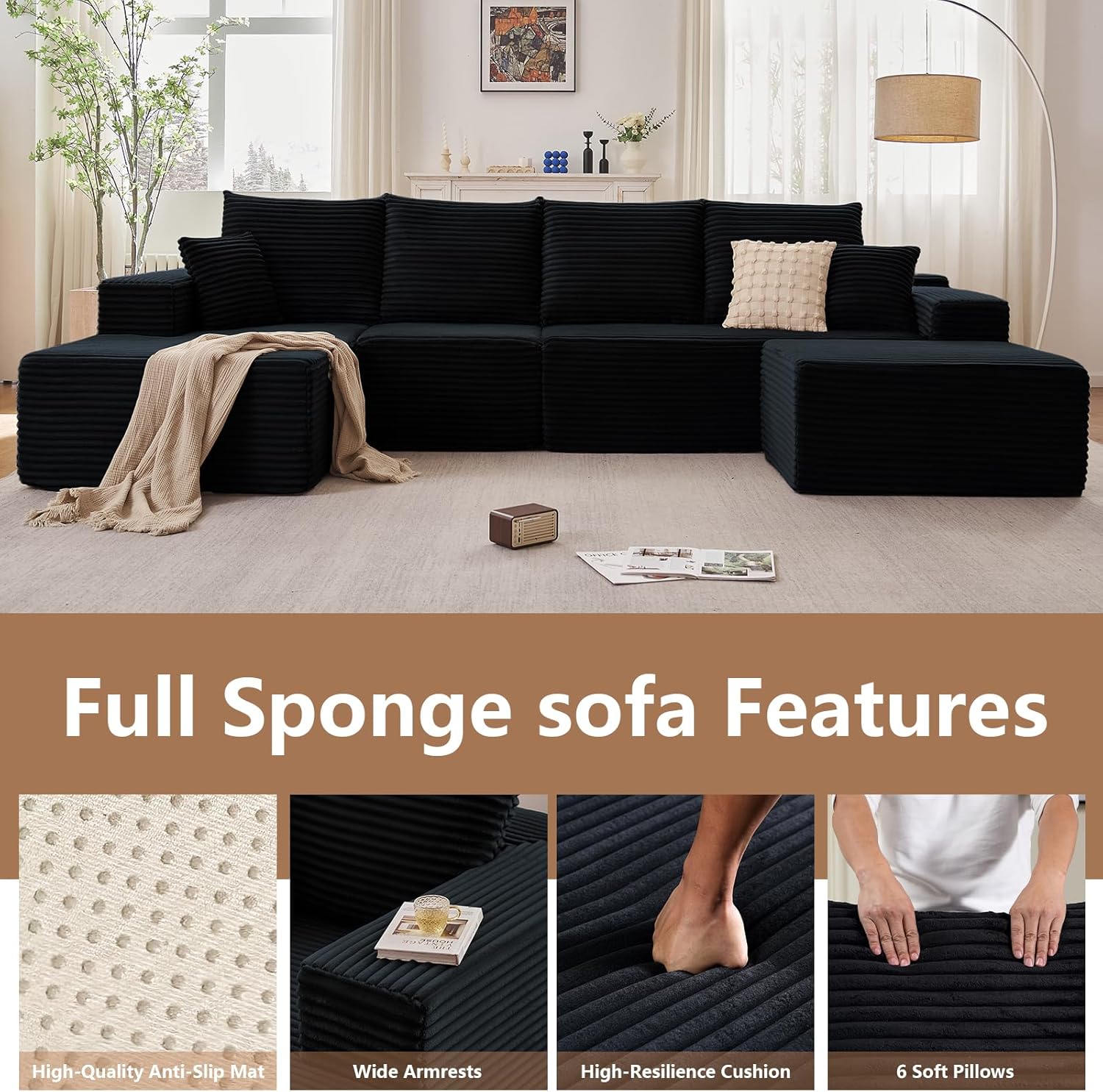 135.4″ Modular Sectional Sofa with Ottoman, Modern Corduroy Cloud Couch with Deep Seat, Boneless Couch Upholstered 4-Seater U-Shaped Sofa for Living Room, No Assembly (Black, Left-Facing Chaise)