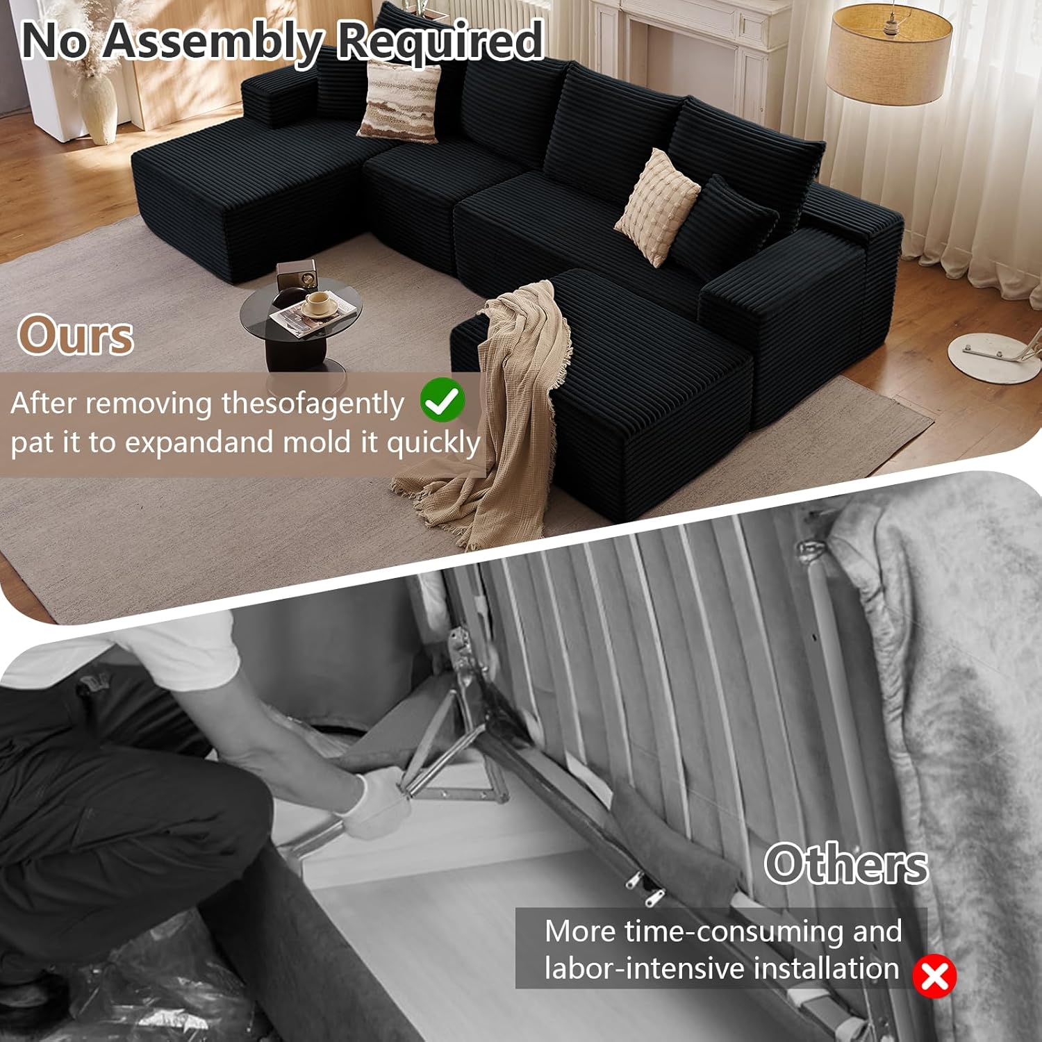 No Assembly Required: Say goodbye to the stress of complicated assembly! Our boneless sofa arrives fully assembled—simply unbox, fluff the cushions, and within 72 hours, you’ll have a beautifully shaped chenille sofa ready to enjoy. No tools, no hassle—just immediate comfort and style. With generous dimensions of 135.4”W x 69.7”D x 37.8”H, this spacious sectional is the ideal centerpiece for your living space, offering both style and comfort without the frustration of assembly