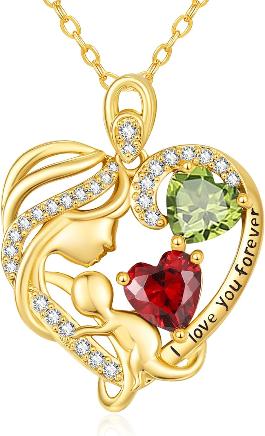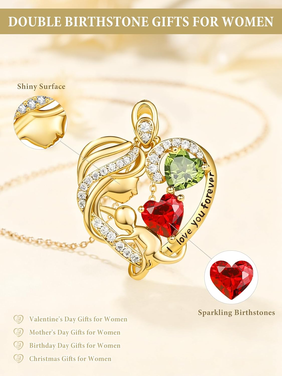 14K Gold Double Birthstone Heart Necklace for Women Mom, Mother Son/Daughter Pendant Necklace for Christmas Mother’s Day Birthday Gifts for Wife Daughter Grandmom