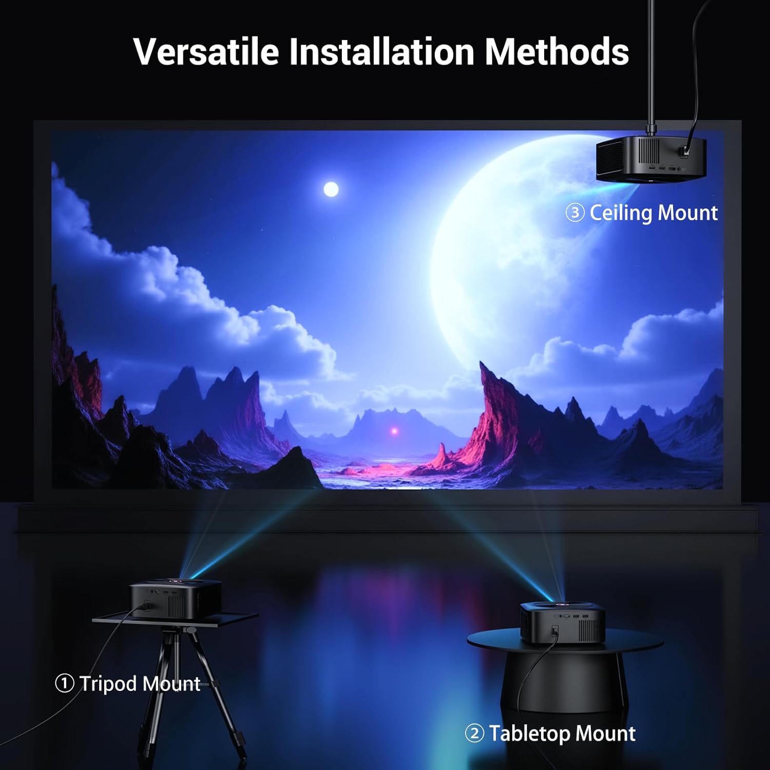 [Adaptable Installation for Any Space ]- HAPPRUN tv projector features a compact design with flexible installation options—desktop, tripod, wall, or ceiling, meeting different projection needs.