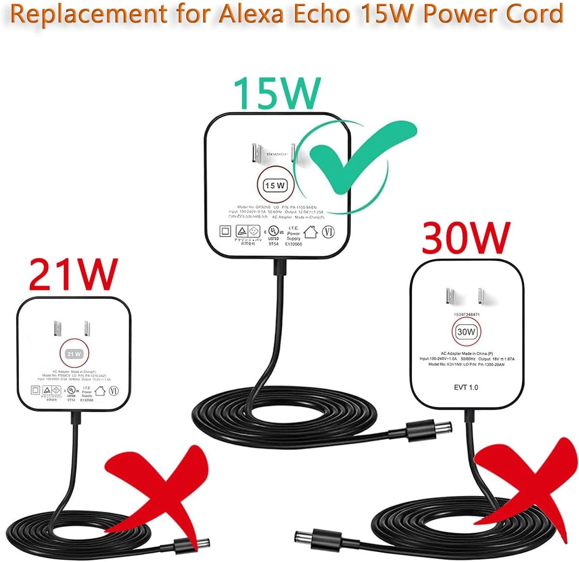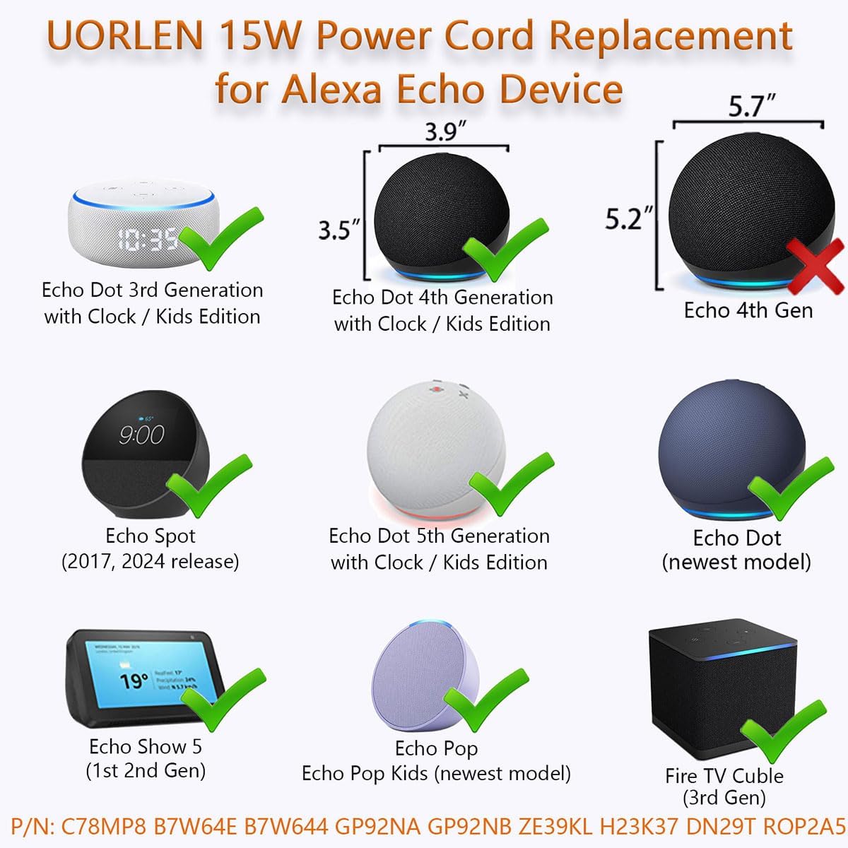 COMPATIBLE WITH: UORLEN 15W Alexa Power Cord Replacement for Echo Show 5 (1st 2nd Gen), Echo Dot 3rd/4th/5th Generation, Echo Dot with Clock, Echo Dot Kids Edition, Echo Spot, Echo Pop, Fire Cube Smart Speaker (3rd Gen), P/N: C78MP8 B7W64E B7W644 GP92NA GP92NB ZE39KL H23K37 DN29T RQP2A5 D9N29T and other portable DVD EVD, media player streaming devices