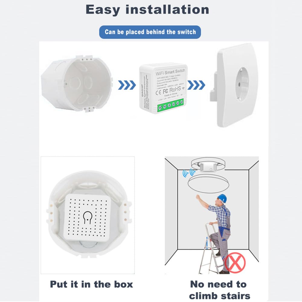 Compact 16 A Wi-Fi smart module slips into most standard wall boxes (86 mm, 118 mm, 120 mm or similar) without altering your décor; traditional switch and smart control run independently and never interfere, giving you instant app or voice control over 16 A appliances like air-conditioners, space heaters, dishwashers, microwaves and more.
