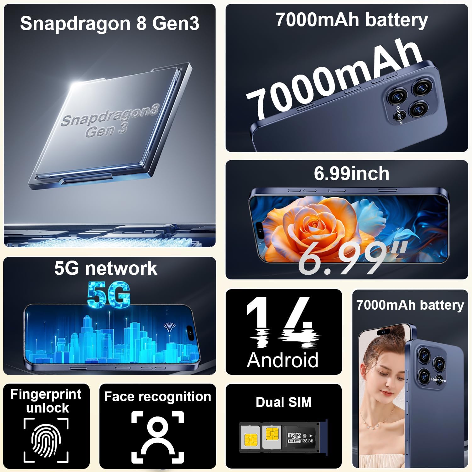 Specification: 16ProMa x 5G Unlocked Smartphone,12GB+512GB 7000mAh Fully Cell Phone for Android 14, 6.99″ HD Screen Unlocked Cell Phone, 68MP+108MP Dual Camera/Dual SIM/Fingerprint (Deep Blue)