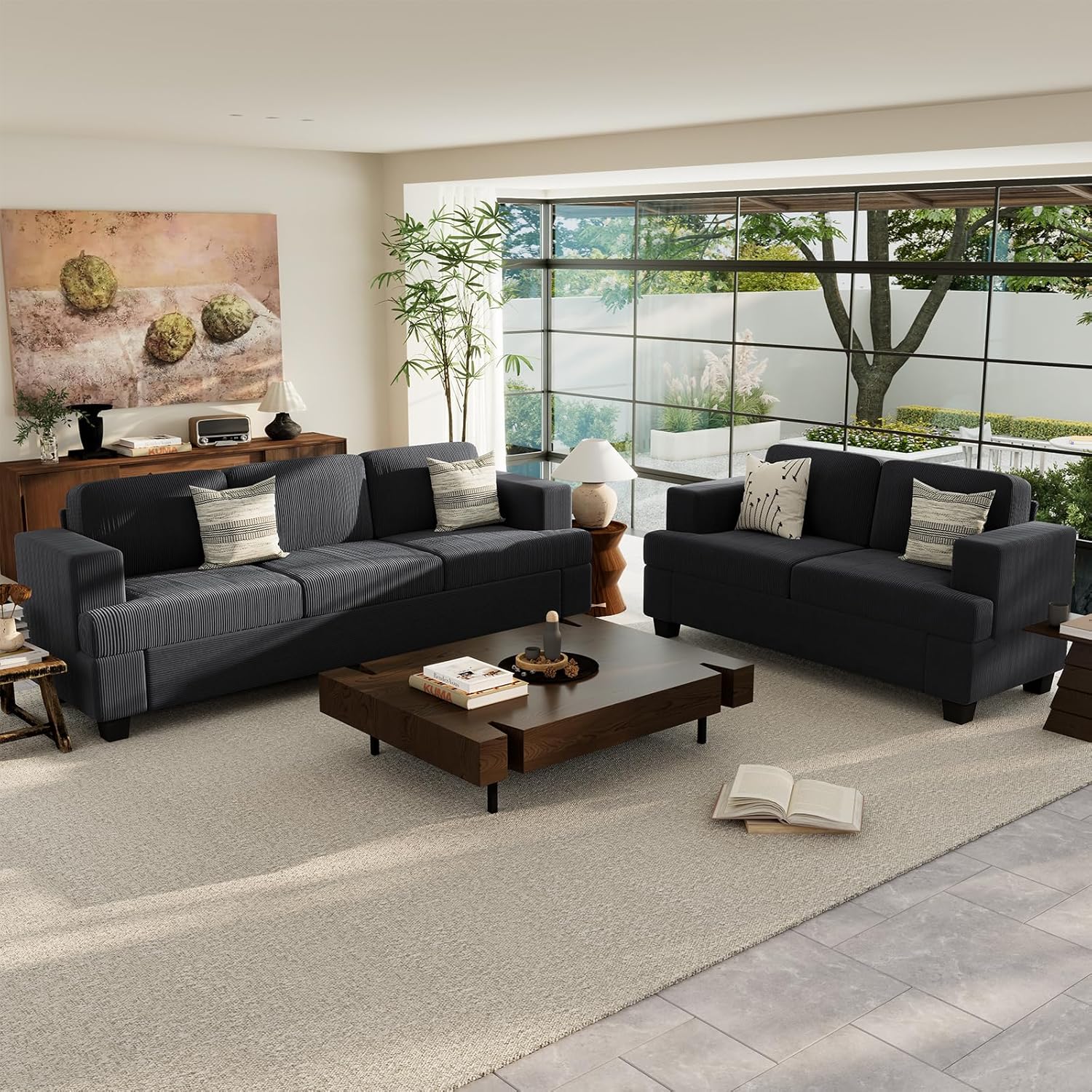 2 Pieces Corduroy Couch Set for Living Room, Black Cloud Sofa, Deep Seat Floor Couch for Bedroom, Futon Modern Sofa Sectional Bed, Black Corduroy