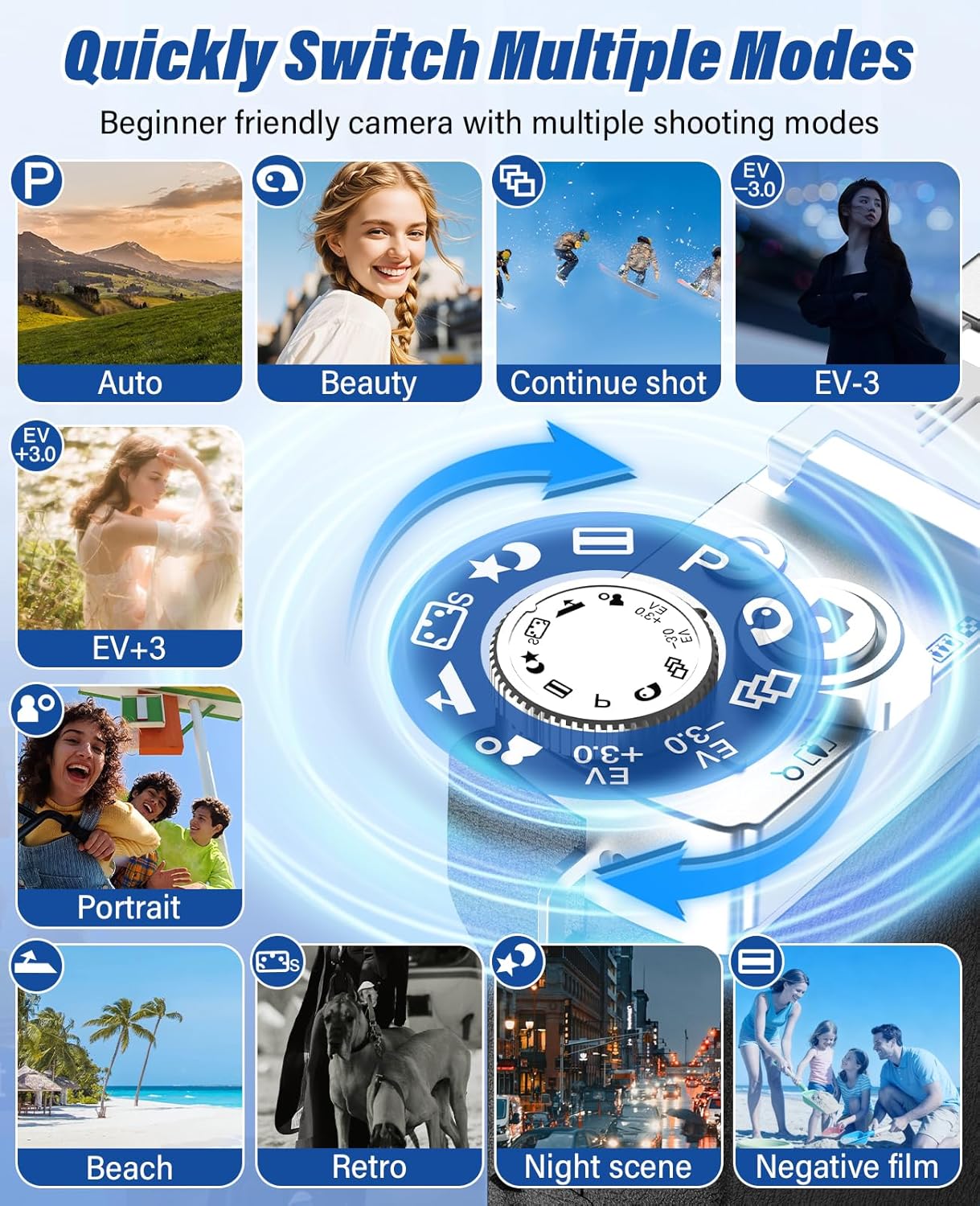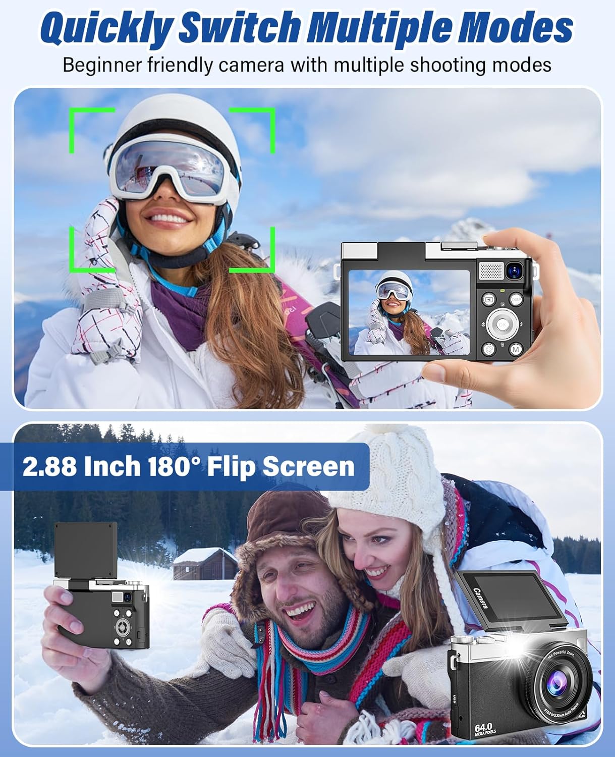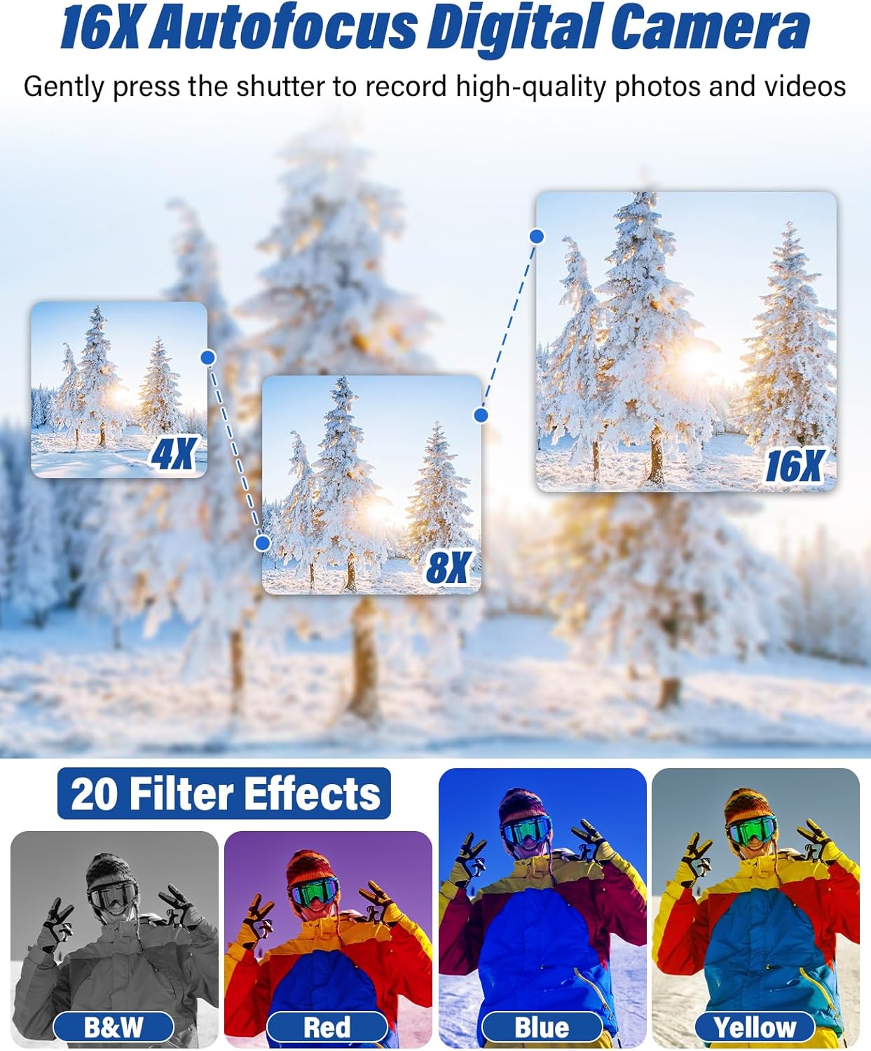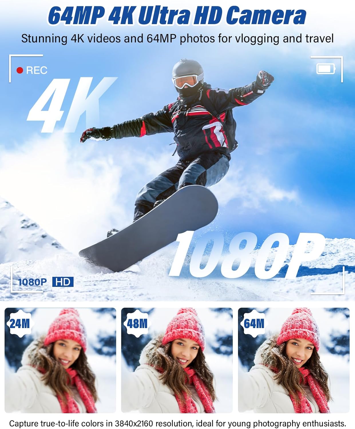 【4K Digital Camera With Autofocus】This digital camera is equipped with the latest advanced CMOS sensor, capable of capturing vibrant 64MP photos and recording 1080 video at 30fps. The built-in fill light enhances visibility in low-light conditions, ensuring your videos look polished and professional. With intuitive system settings and a user-friendly interface, it’s perfect for beginners and teens, making it an excellent choice for everyday use and travel photography.