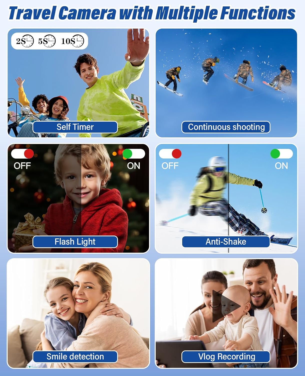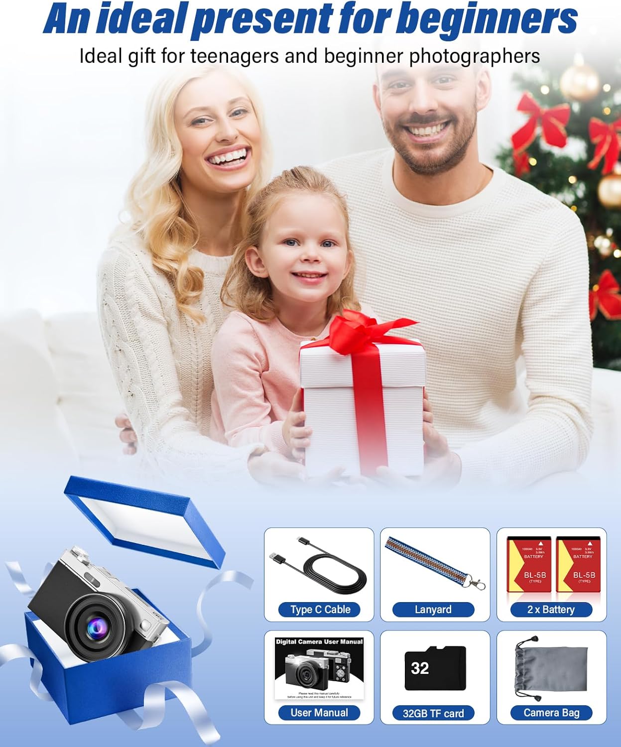 【Powerful Travel Camera】This compact digital camera is lightweight and portable enough to fit in your pocket or bag, making it perfect for travel. Ideal for adventures and vlogging on the go, it comes with a 32GB TF card and a long-lasting high-capacity battery to ensure uninterrupted shooting whether at home or outdoors. A reliable companion for vacations, trips, camping, and expeditions.