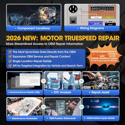 🏆【New Motor Truspeed Repair, First Access to OEM Repair Information】2026 Motor Truspeed Repair is an optional PAID function. You can pay 650$/yr to get it if you need it. Upgraded from intelligent diagnostics, 2026 MOTOR makes you more streamlined to access the OEM-database, including ✅Technical Service Bulletin (TSB) ✅Component Locations✅Wiring Diagrams✅DTCs Analysis ✅Maintenance Schedules ✅Repair Procedures ✅OEM Position Statements ✅Specifications, etc. All data are from real repair workshops and repeatedly verified by professional mechanics.