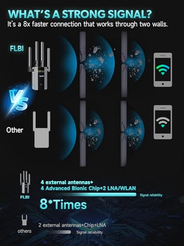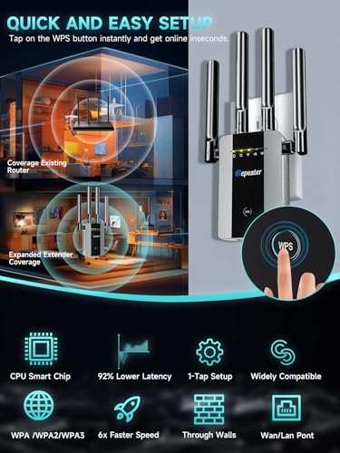 STABILITY AND ULTRA-FAST SPEED: Our latest WiFi extender is powered by a high-performance CPU for fast, stable speeds, and its Intelligent biochip core processor reduces latency and buffering for a seamless online experience. Whether you\’re streaming HD content, gaming, browsing, or video chatting, you’ll enjoy smooth, uninterrupted connectivity. With the advanced Bionic Chip and four high-gain external antennas, this device ensures fast internet over long distances and reliable wireless access for your whole family.