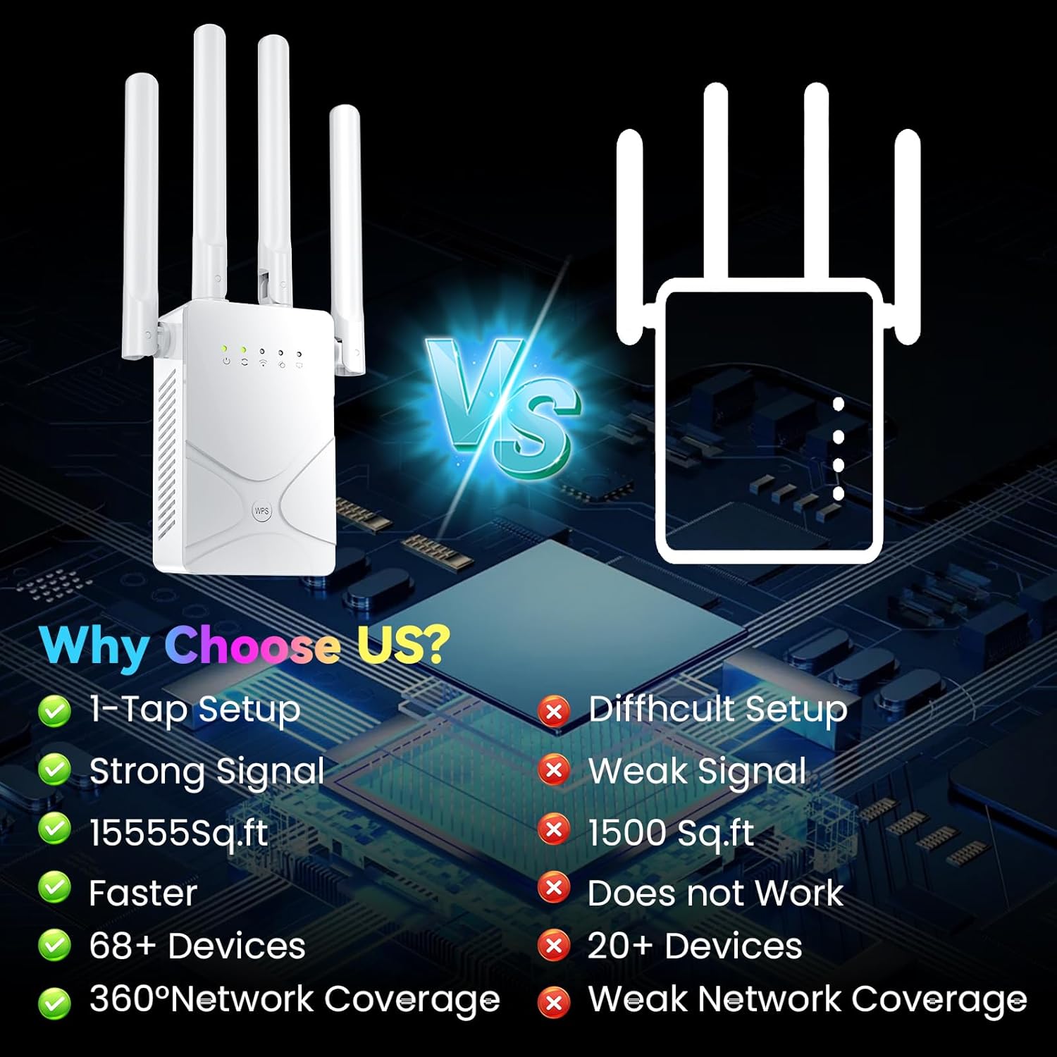𝙒𝙖𝙡𝙡𝙨/𝙁𝙡𝙤𝙤𝙧𝙨 𝙗𝙡𝙤𝙘𝙠 𝙒𝙞𝙁𝙞? Our Wi-Fi extender solves it! It covers up to15555 Sq.Ft, from kitchen to attic. Strong penetration breaks through concrete walls, no dead zones. Great for daily streaming, video calls, and smart home devices. Most importantly, it’s easy to set up—no tech skills needed. Enjoy full WiFi coverage in minutes!