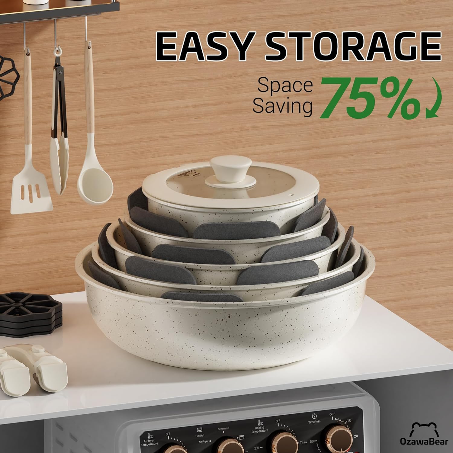 75% Space Saving: OzawaBear’s removable cookware set fits neatly in tight spaces—only 10” x 10” x 8” when stored. Free up 75% more cabinet space and enjoy the perfect solution for small kitchens, RVs, and camping trips.