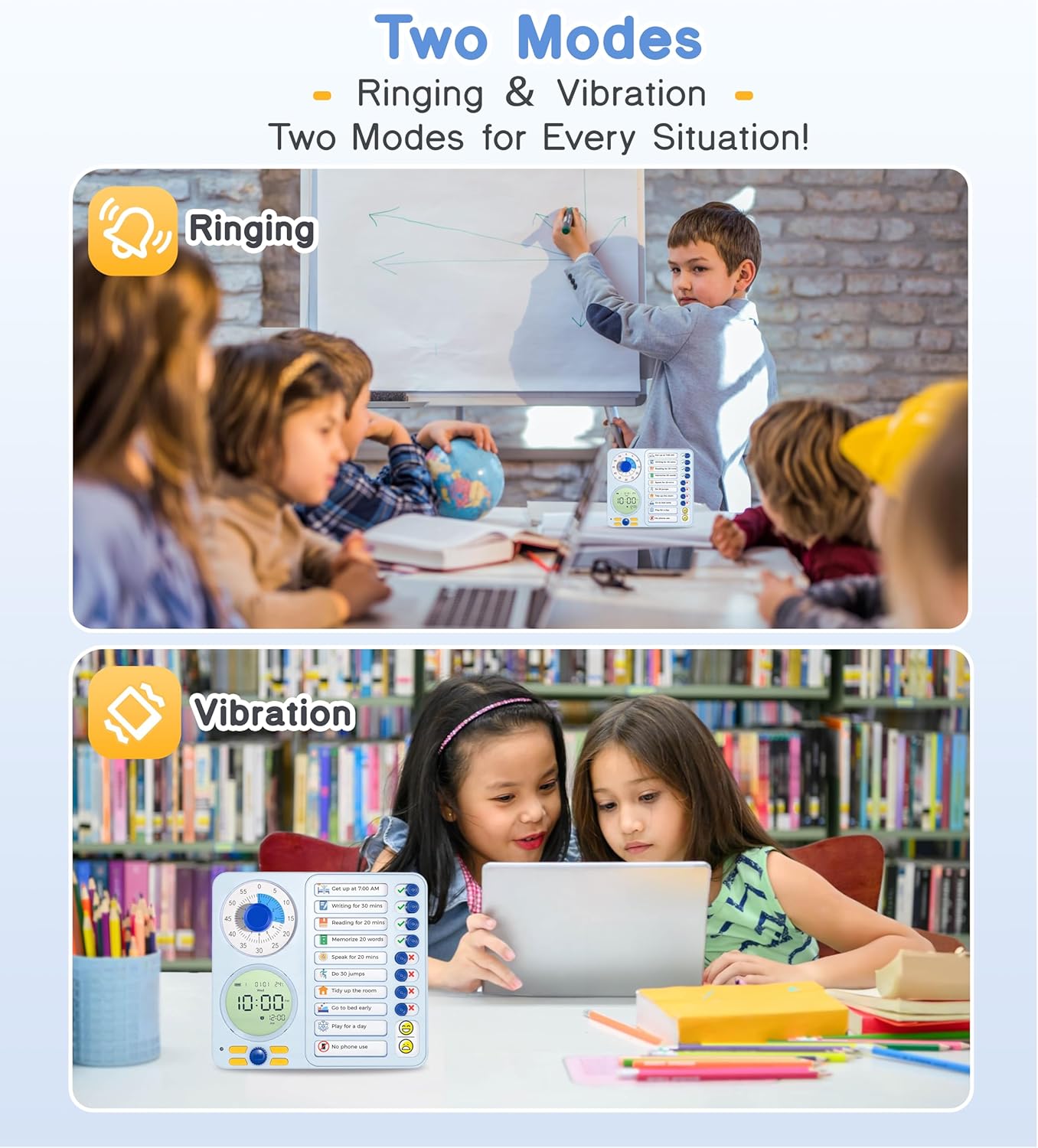 Silent, Vibration, Ringing Modes : Choose silent visual cues, vibration, or adjustable alarms to match different needs. Perfect for home, school, library, and quiet spaces, this silent countdown timer helps children stay on track without unnecessary noise, ensuring they can focus on their tasks, Its hourglass design clearly shows the passage of time, making it easy to understand for people of any age