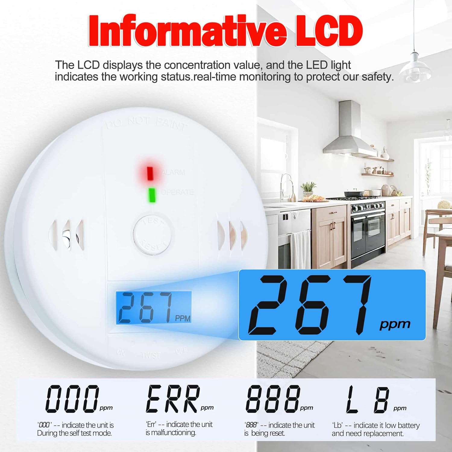 Instant Alert: When carbon monoxide detectors rise to alarm levels, CO sensor detects CO, the red LED will flash,LCD Blue back light will be lighted, An early warning will be delivered through a loud 85-decibel alarm.