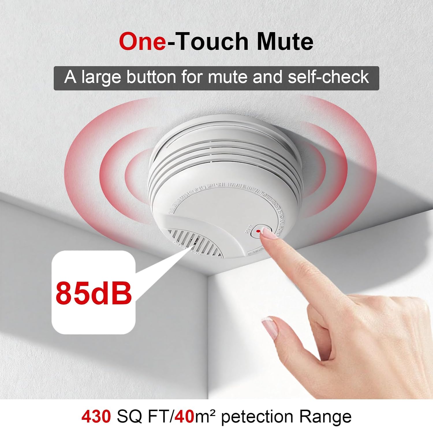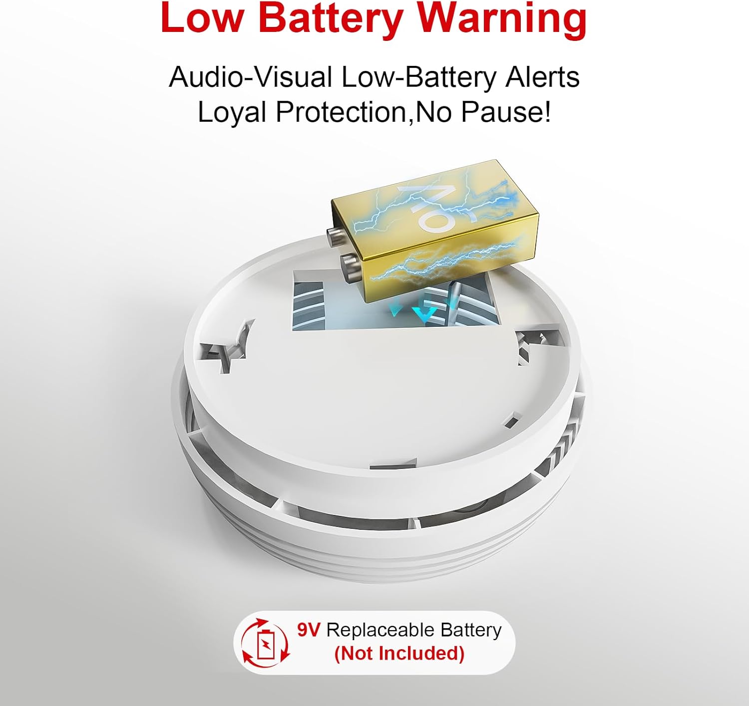 【85dB Loud Alarm with One-Touch Silence】The smoke alarm produces a powerful 85dB alarm with strong penetration, clearly audible even through walls or floors. Battery-operated smoke alarms run on a replaceable 9V battery with low power consumption. Includes convenient one-touch Test and Silence functions for daily use or cooking scenarios.