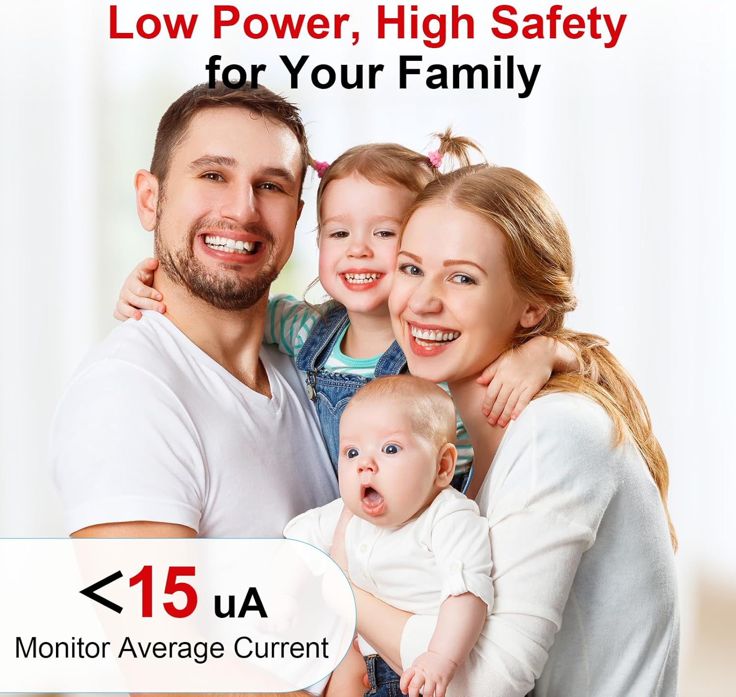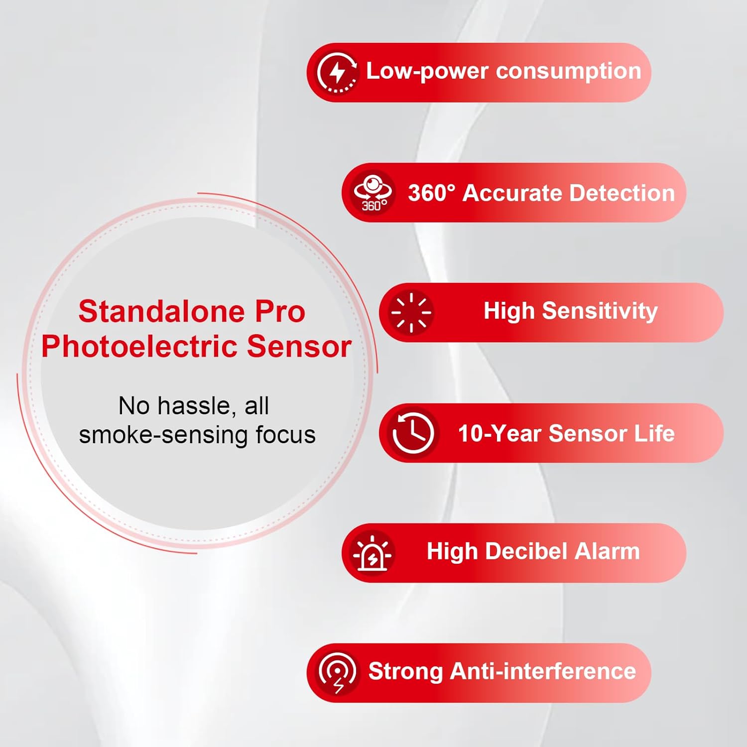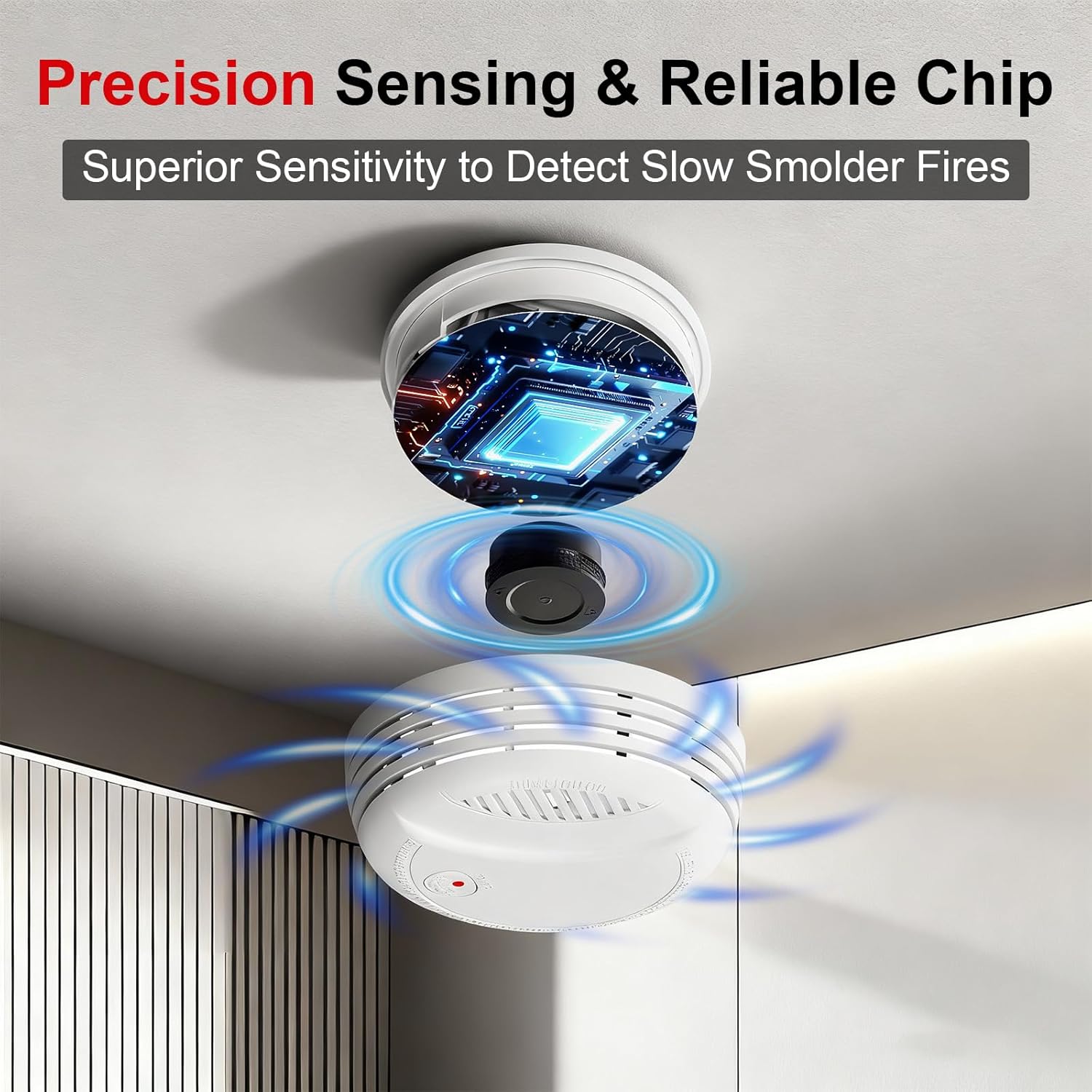 【Highly Sensitive Detection with Reduced False Alarms】Equipped with a high-performance photoelectric sensor for accurate detection of slow-smoldering fires such as sofa, mattress, or wiring faults. The built-in 0.1 BAR high-sensitivity chipset delivers a rapid 0.08-second response, while AI filtering identifies harmless smoke (e.g., light cooking smoke) to effectively reduce false alarms.