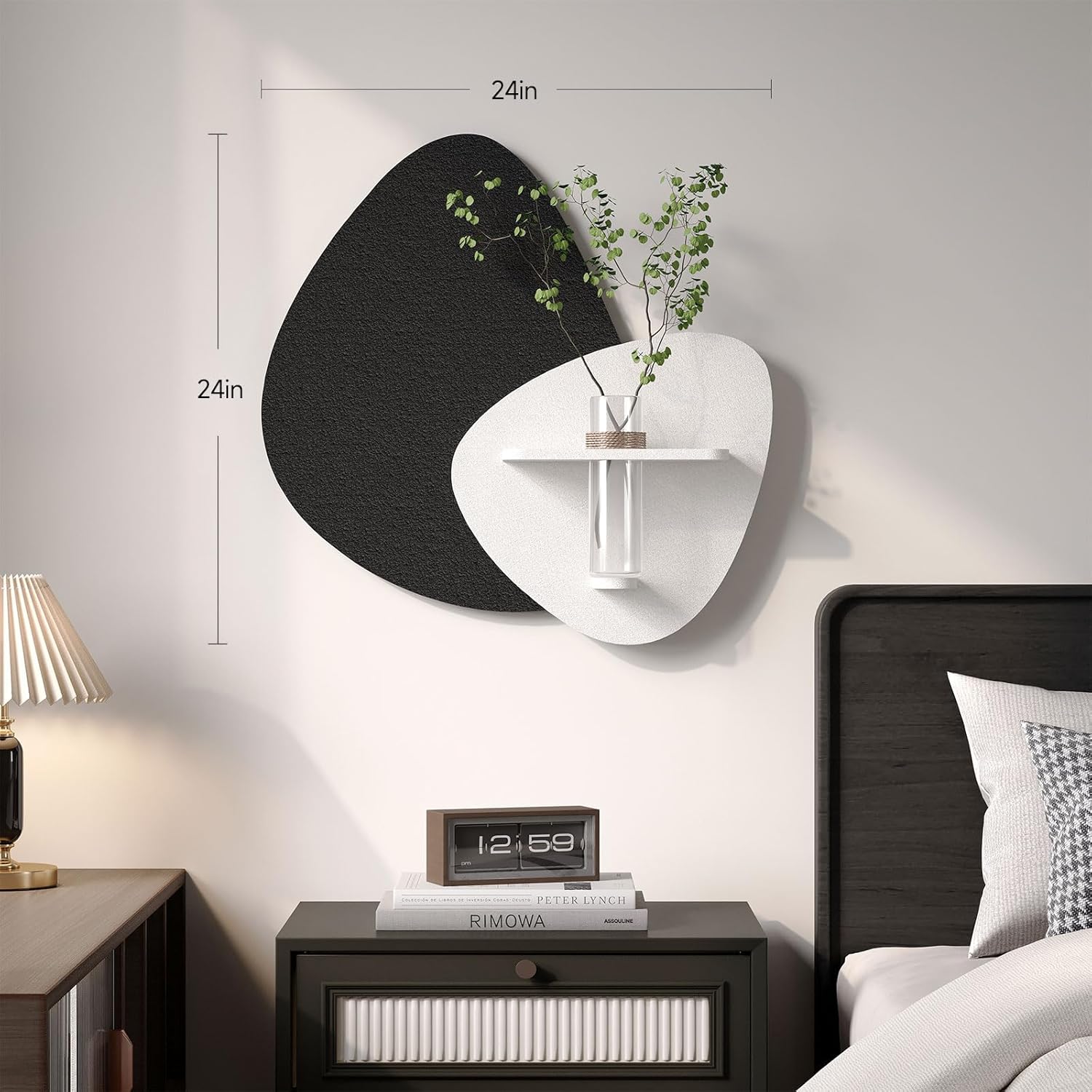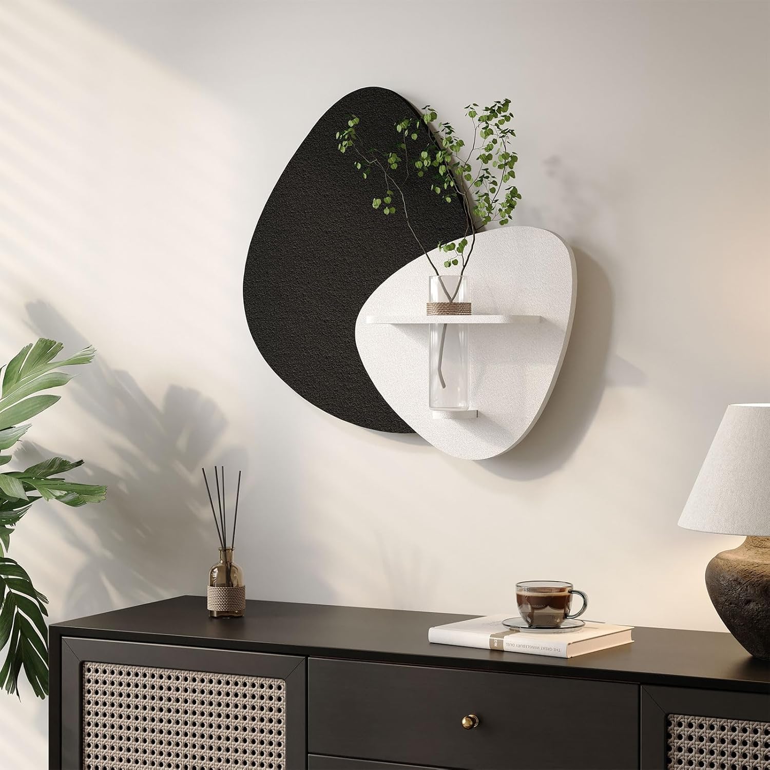 [3D Wall Art]: Measuring 24×24 inches, this unique piece combines stunning sculptural design with practical functionality. It features a built-in shelf and a real vase that includes one lifelike artificial plant, adding a subtle touch of greenery. Use the shelf and vase to display small items, keys, or dried florals—bringing both charm and convenience to your home or office decor
