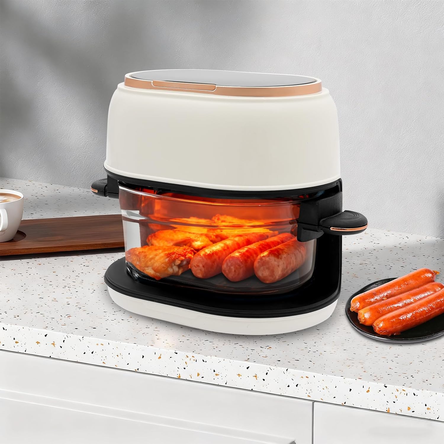 LARGE 4.2 QT CAPACITY: With its spacious 4.2-quart glass basket, this air fryer is perfect for family meals or entertaining. It comfortably cooks up to 2 lbs of french fries, 10 chicken wings, or a variety of vegetables all at once, saving you time in the kitchen.