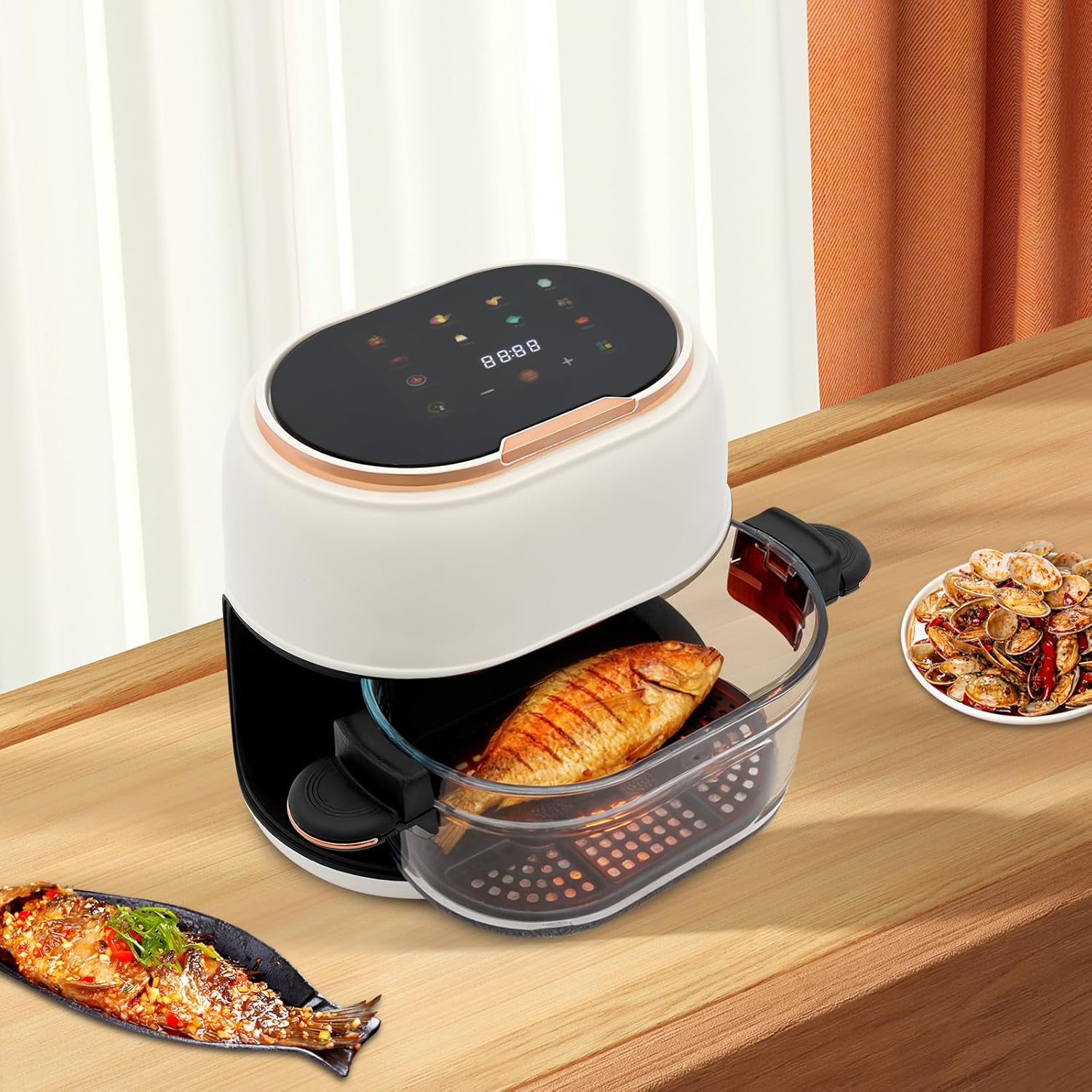 This air fryer is the ideal cooking partner in your kitchen with its modern and minimalist design and efficient functionality. Its surface is not only aesthetically pleasing but also easy to clean and maintain. The large capacity cooking chamber can accommodate a large amount of ingredients, whether it’s chicken, French fries, or vegetables, all of which can be easily handled to meet the needs of family gatherings or daily dining.