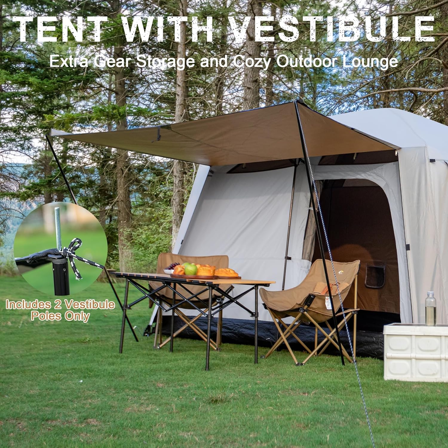 EXPANDABLE PORCH DESIGN: Easily support the front and side doors with poles to create a spacious porch area for relaxation or gear storage. When not in use, simply roll up and secure it with olive cordlocks. Ideal for camping, picnics, or outdoor events. Note: The package includes 2 support poles only, the other 2 poles need to be purchased separately or replaced with tree branches