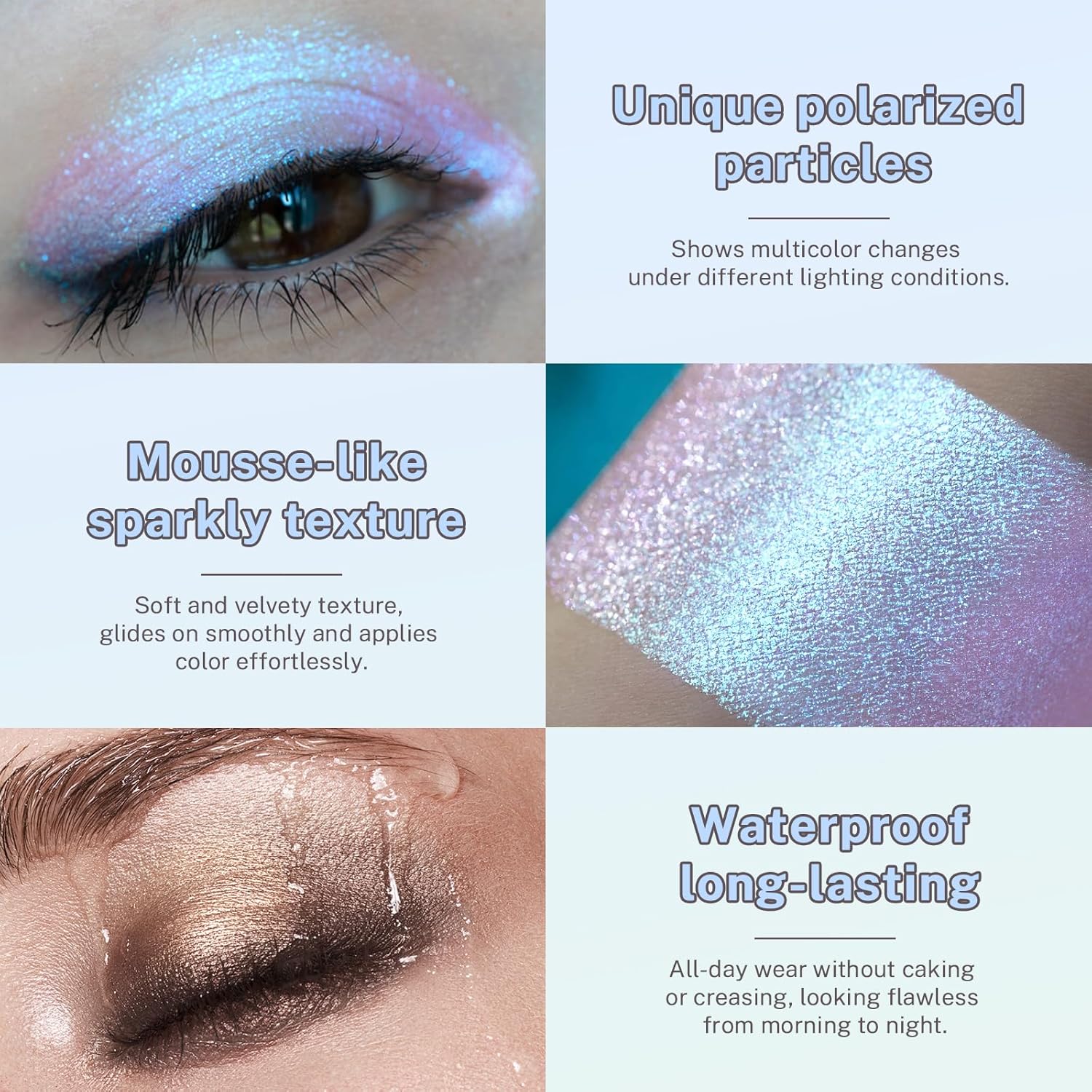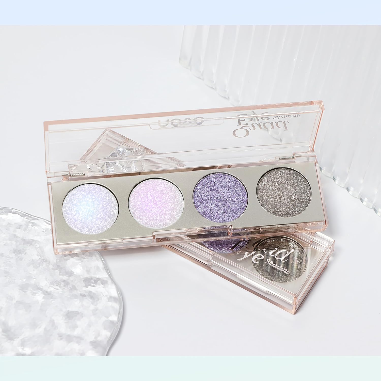 Chameleon Eyeshadow Palette: This iridescent eyeshadow palette contain 4 amazing color: blue, pink, sparkly white, and cool tones. With just a light swipe, it delivers a sheer, natural shimmer with a dreamy, beautiful finish. It creates a uniquely eyeshadow look and brightener your skin