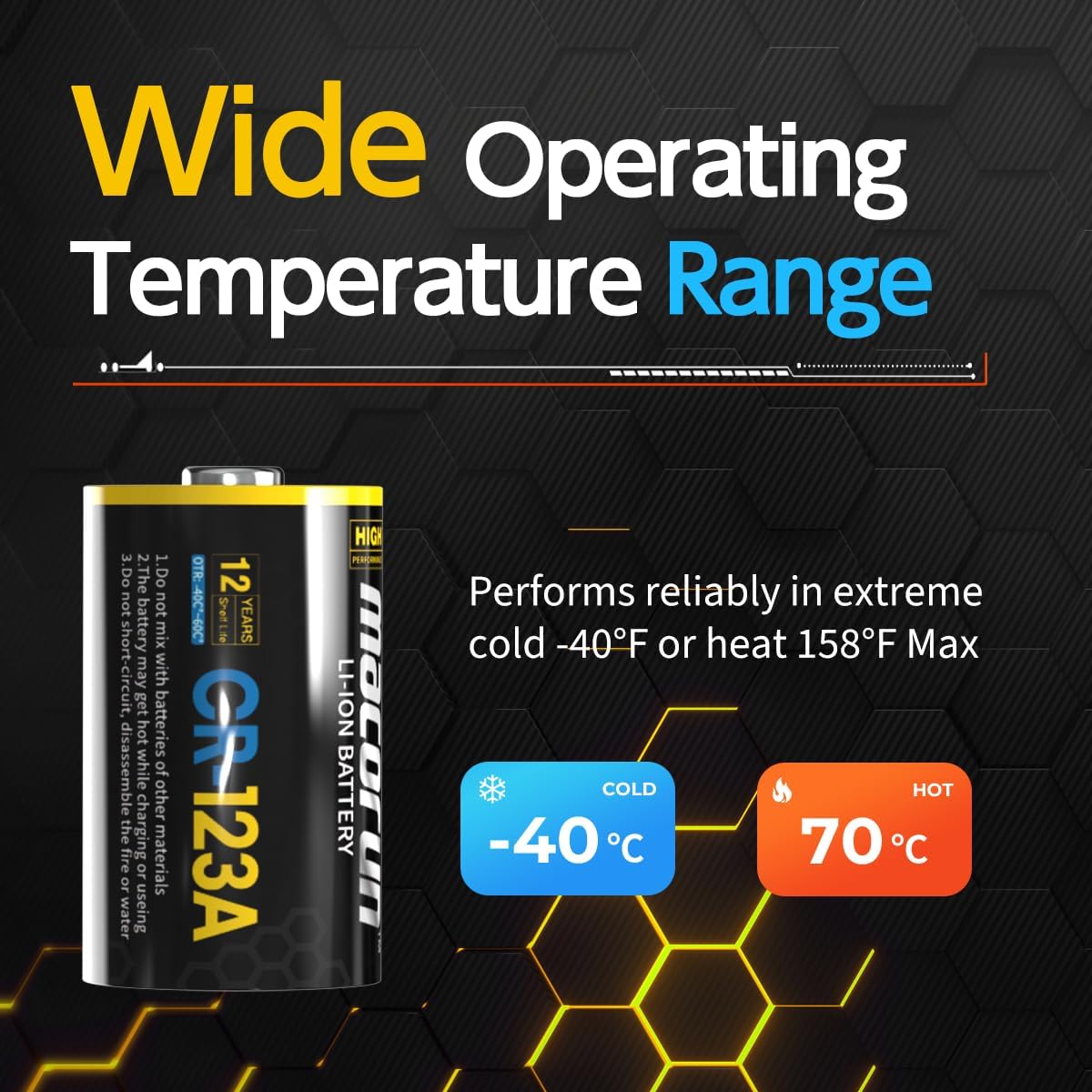 Ready for Immediate Use: No charging required—just install and go. Perfect for emergencies, daily use, and professional applications.Replace for: CR123, CR123A, CR17345, DL123A, EL123AP, K123LA, SF123A, VL123