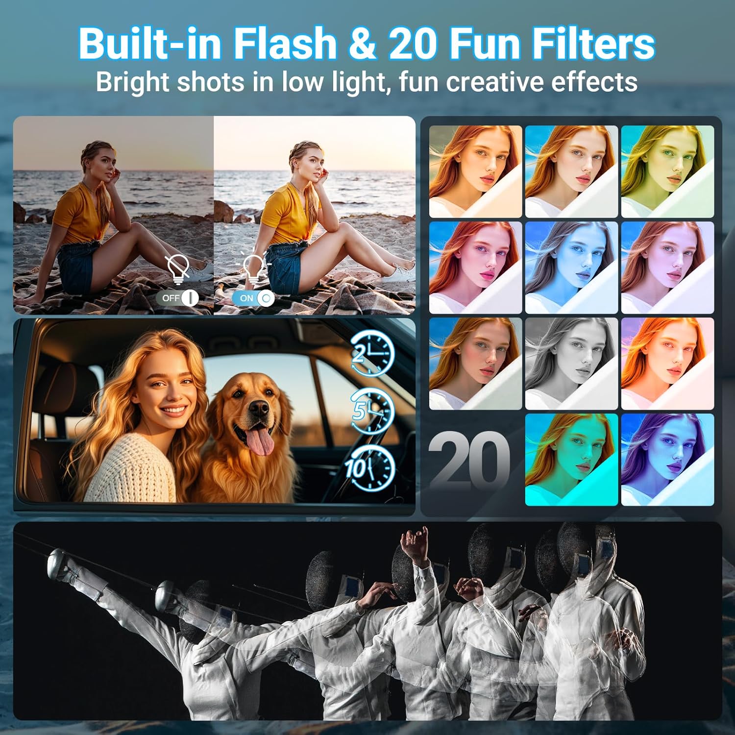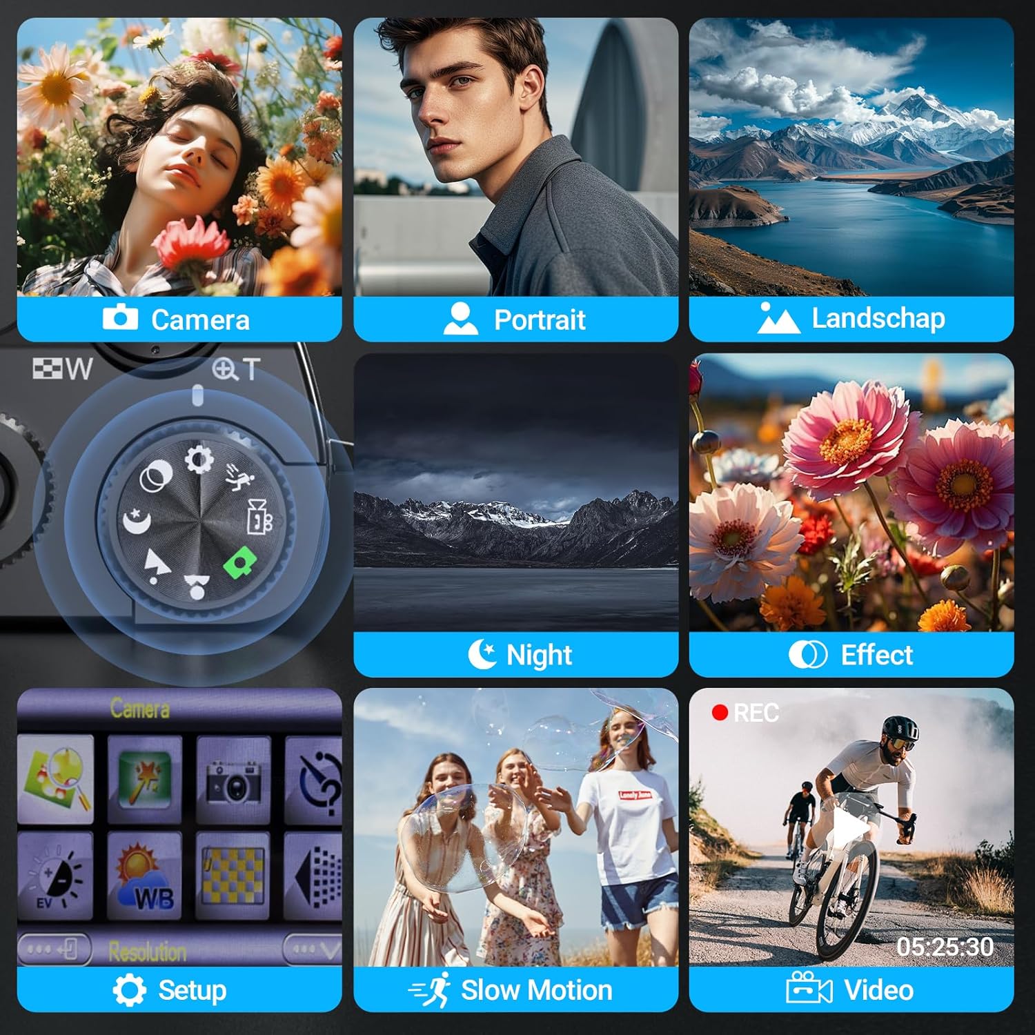 【Creative Modes & Easy for Beginners】This point and shoot camera includes multiple fun shooting modes and filters—time-lapse, slow motion, vintage tones, and more—making it suitable for beginners and hobbyists. The intuitive menu and one-button operation make it especially beginner-friendly and also a great digital camera for teens who are learning photography or expressing creativity.