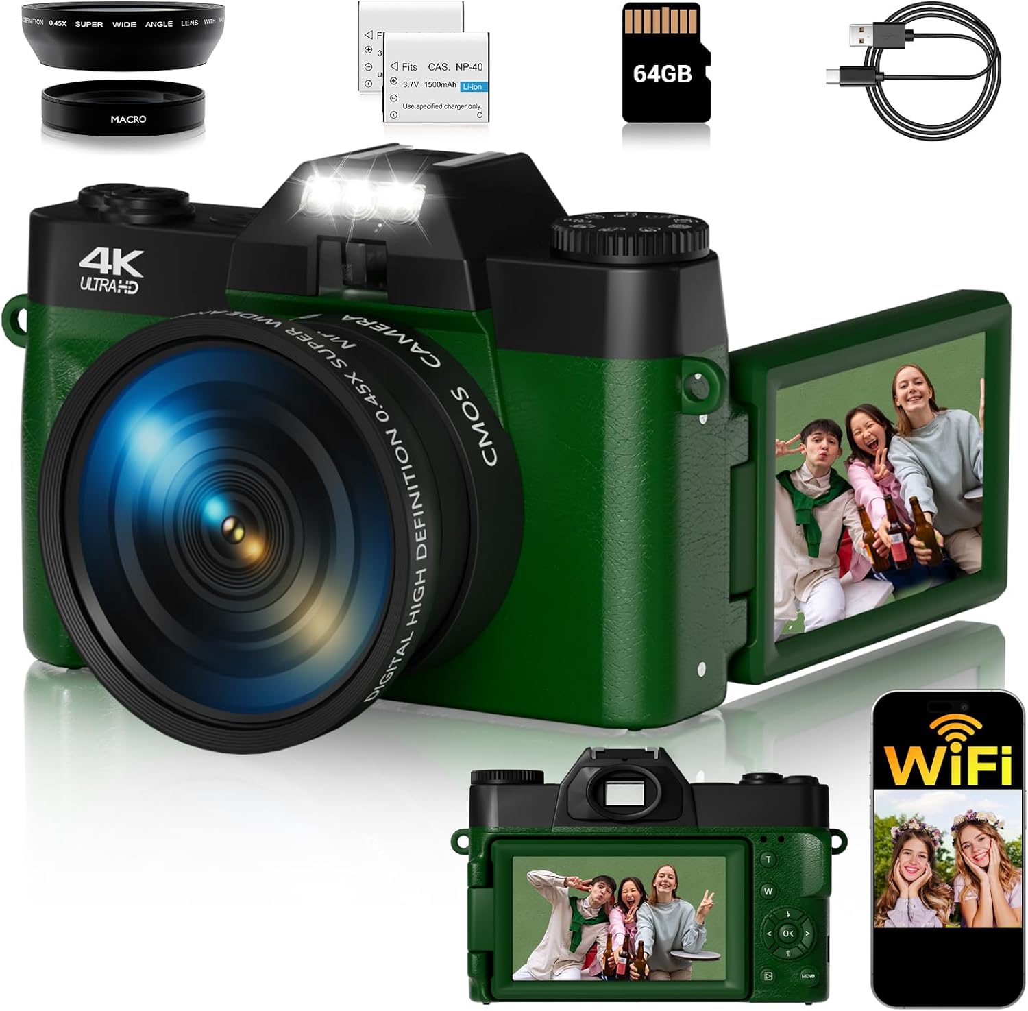 Specification: 4K Digital Camera for Photography Autofocus 75MP 16X Digital Zoom with 3” 180° Flip Screen Vlogging YouTube Video Students Compact Cameras with 2 Batteries 64GB Micro SD Card(DeepGreen)