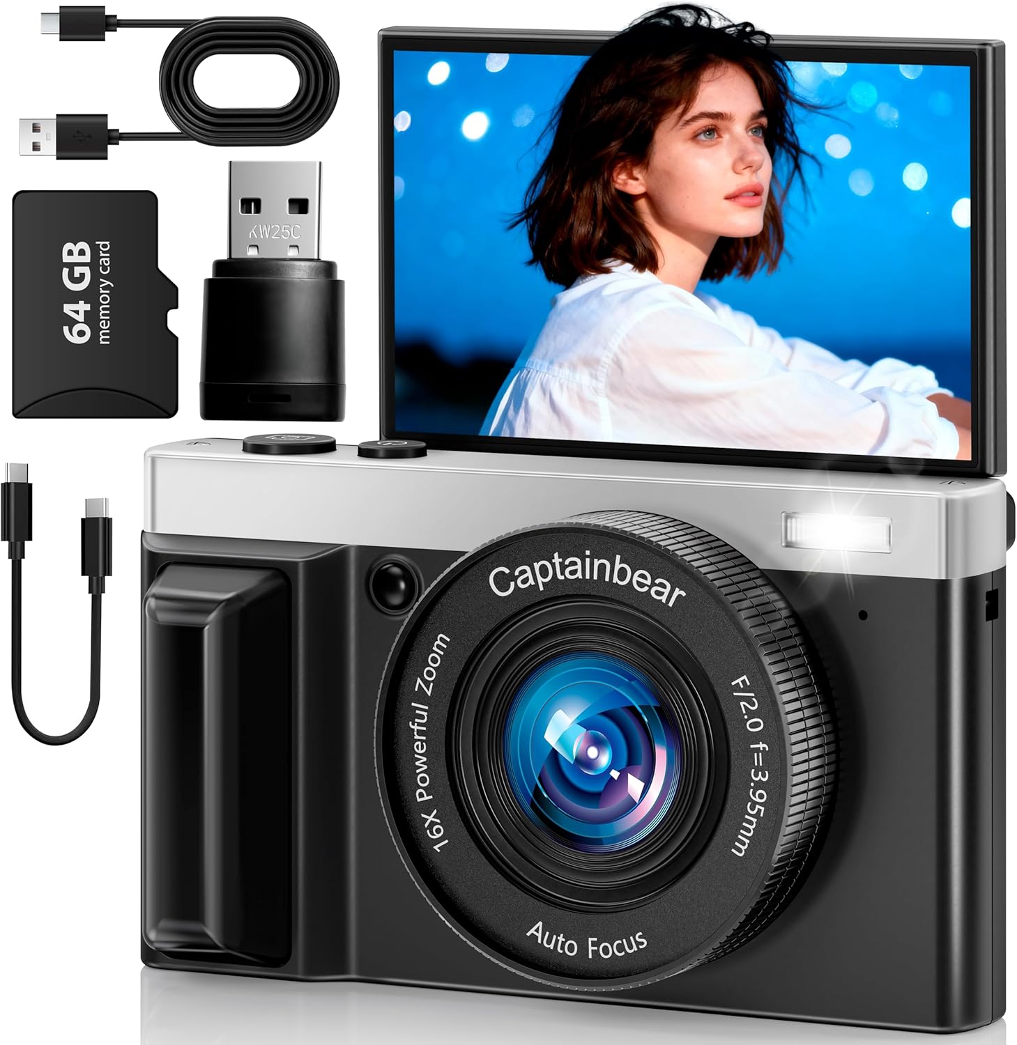 【Long Battery Life & Ample Storage】Equipped with a 1500mAh rechargeable battery and a 64GB SD card, this cameras for photography supports long shooting sessions without interruptions. You can store up to 8,500 photos or record about 4 hours of 4K video, making it perfect for travel, events, and vlogs. The powerful battery lets you shoot all day without worrying about power or memory.The small digital camera come with an installed 64G SD card, so you can use it right away.