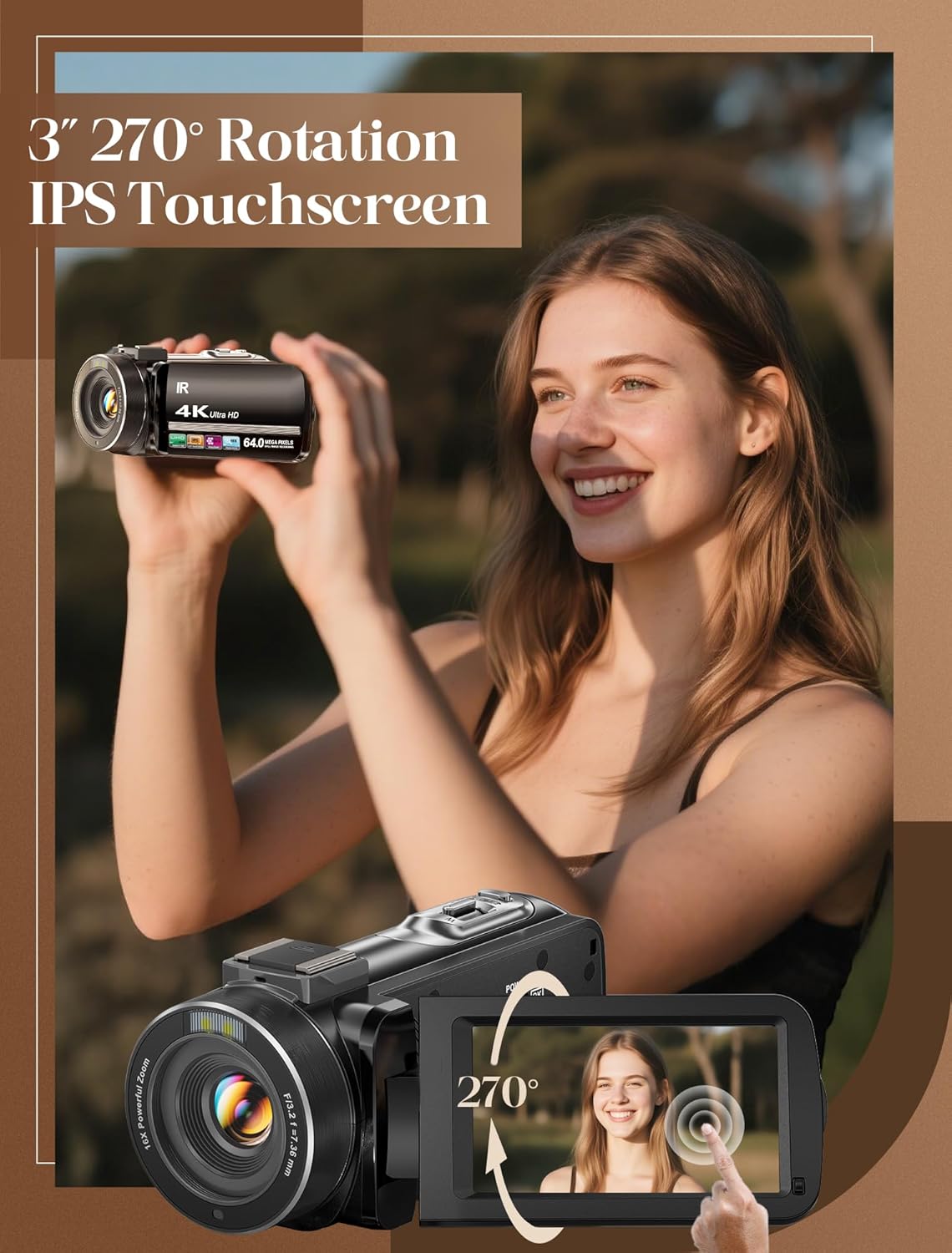 3.0 Inches Touchscreen with 270° Rotation: This camcorder features a brilliant 3-inch touchscreen that puts complete control in your hands. The screen rotates a full 270 degrees, making it a game-changer for vloggers. Easily frame yourself for solo shots, capture high-angle overhead videos, or get creative low-angle perspectives