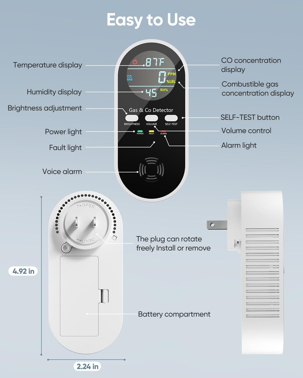 Easy Installation – Plug and play. When CO ≥ 150 PPM or natural gas ≥ 5% LEL is detected, the device sounds a loud alarm and flashes lights. Evacuate immediately.