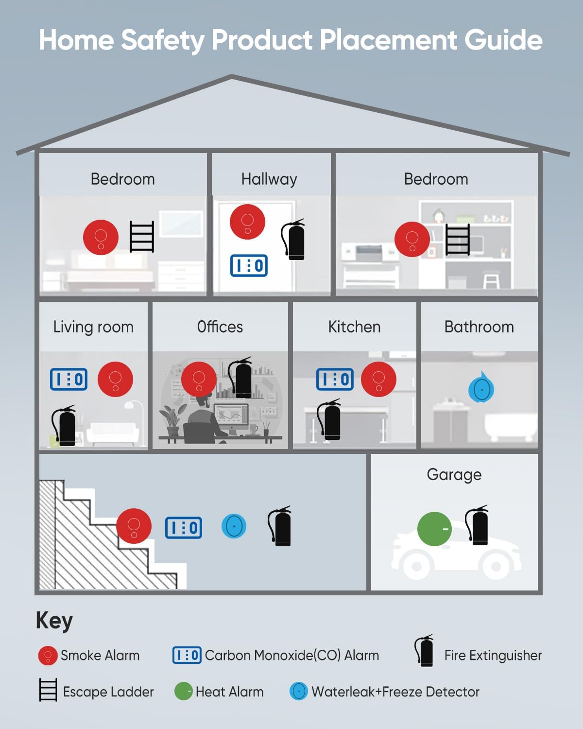 We recommend installing it near bathrooms, kitchens, hallways between bedrooms and bathrooms, garages, or areas with gas appliances. Avoid installing in areas with heavy oil smoke or excessive moisture.