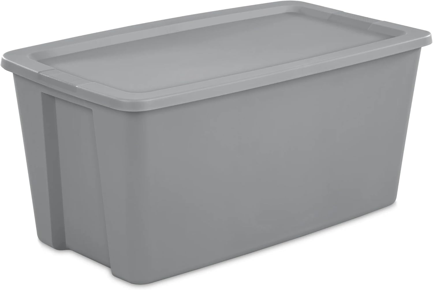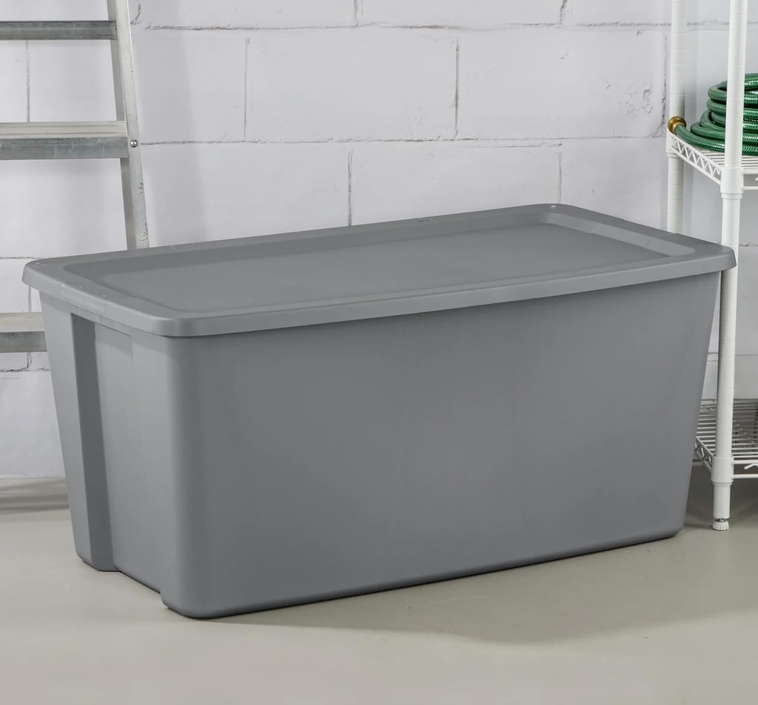 Tidy up your home with this 50 Gallon Gray Extra-Large Plastic Storage Bin with snap-on lid—your ultimate solution for big-ticket storage needs! Its square, space-efficient design features a deep recessed lid for stable stacking, maximizing vertical storage in garages, basements and attics. A reinforced broad rim boosts durability, while textured integrated handles make lifting and carrying effortless. This oversized tote neatly contains and conceals clutter, perfect for stowing bedding, off-season clothing, holiday decor, sporting gear and more, keeping your living space neat and organized!