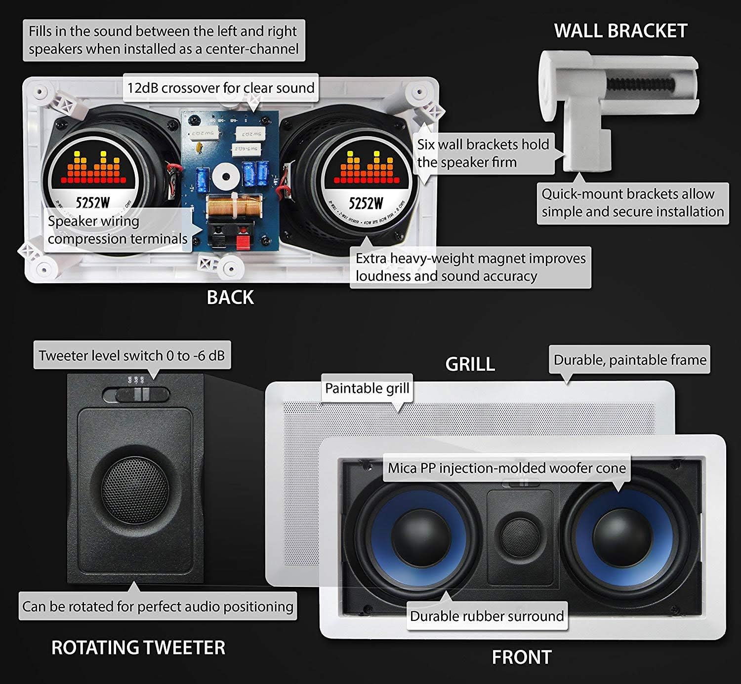 Thousands and thousands sold – the Silver Ticket Dual 5.25 inch 80-Watt Center-Channel 2-Way In-Wall Speaker is a versatile speaker meant for anything from simple stereo applications to whole-home audio and theater systems. The center channel speaker fills in the audio between the left and right channels, bringing movie action and music vocals to life. Suitable for 5.1, 6.1, and 7.1 home systems. Included above and beyond competitors are the two extra heavy weight, high-strength magnets with their field of energy perfectly tuned with the voice coils – it’s all about true efficiency. What does this all mean? – It means you get an excellent speaker that is loud, but not noisy. The speaker will not sound harsh when turned up; it maintains excellent clarity at all volume levels.