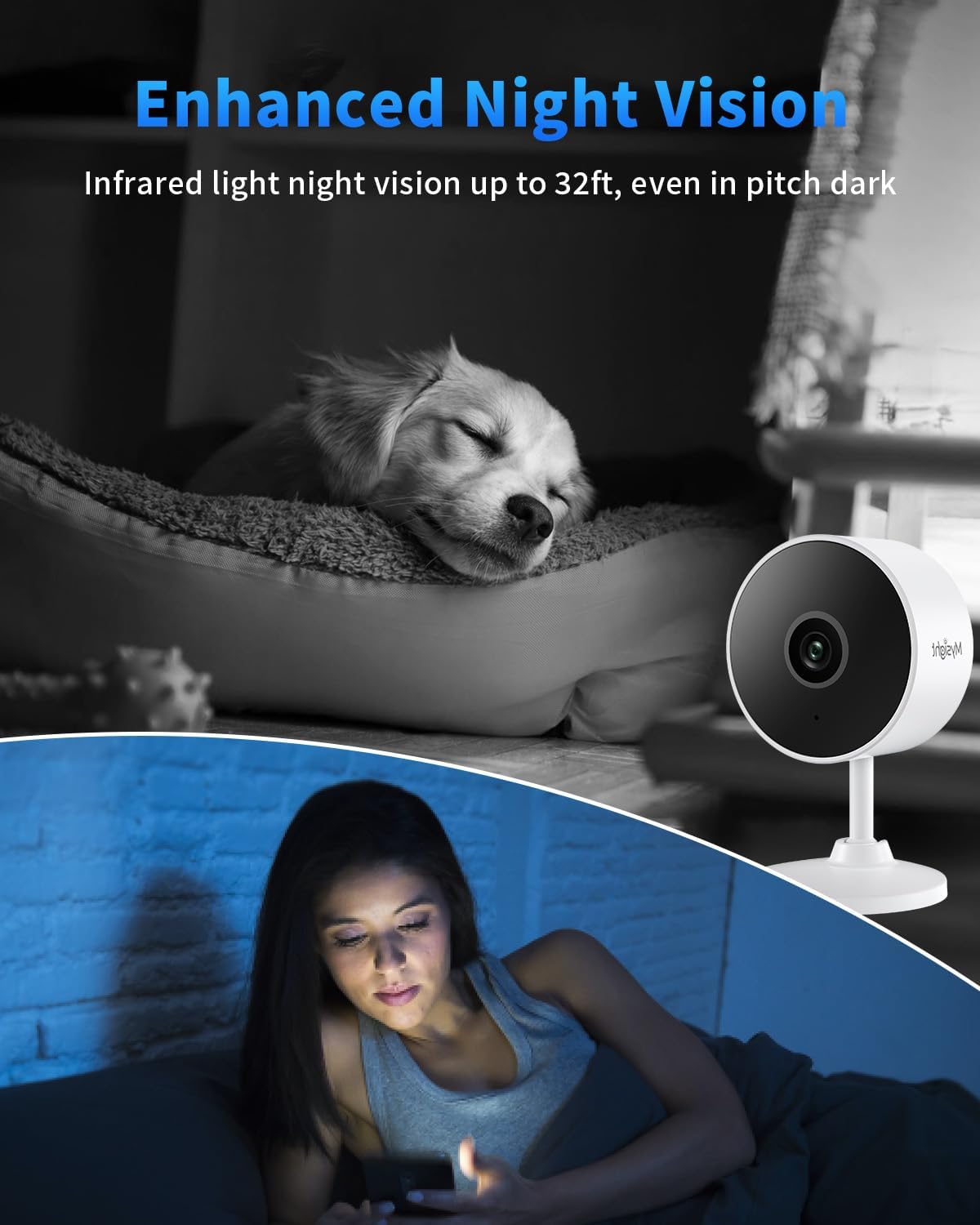 【2K High Resolution】The indoor camera comes with 2K HD resolution, lets you see more clearly the corners you care about, such as a particular license plate number. It has infrared night vision with 2 PIR led to let you see more clearly at night too.