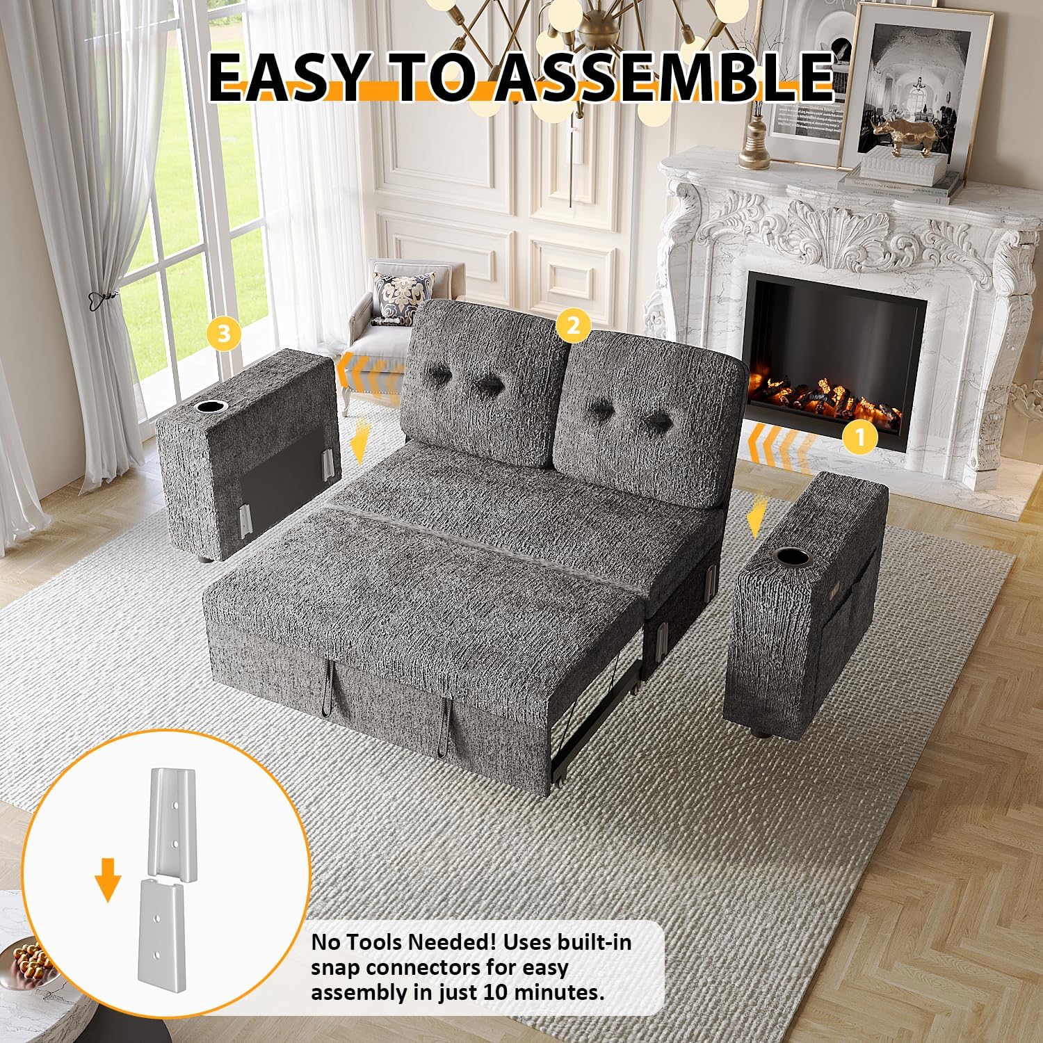 【Tool-Free Assembly】No wrenches or frustration, innovative metal click-lock connectors snap parts together securely. Just lift, align, and snap into place, have your whole sofa set up in under 20 minutes.