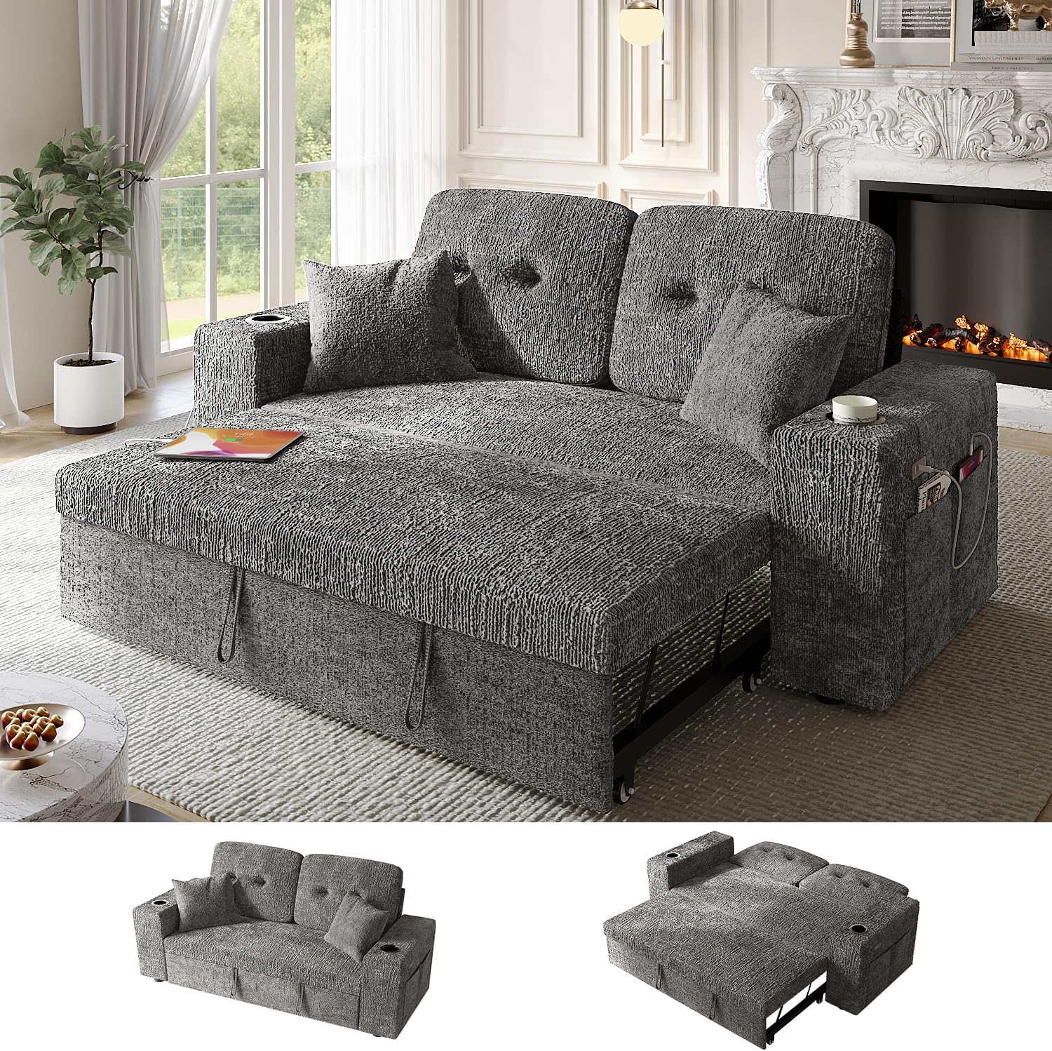 63 Inch Sleeper Sofa Bed, 4 in 1 Pull Out Couch Bed with Adjustable Backrest, Small Loveseat with Wide Armrest | USB Charging | Side Pockets | Cup Holders | Tool Free Assembly, Grey Chenille