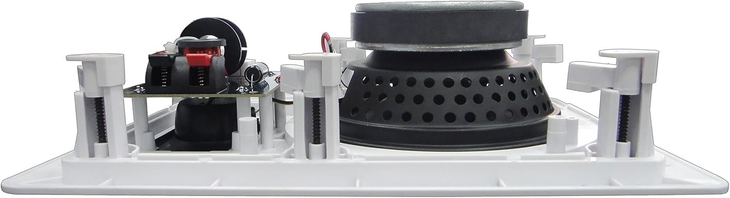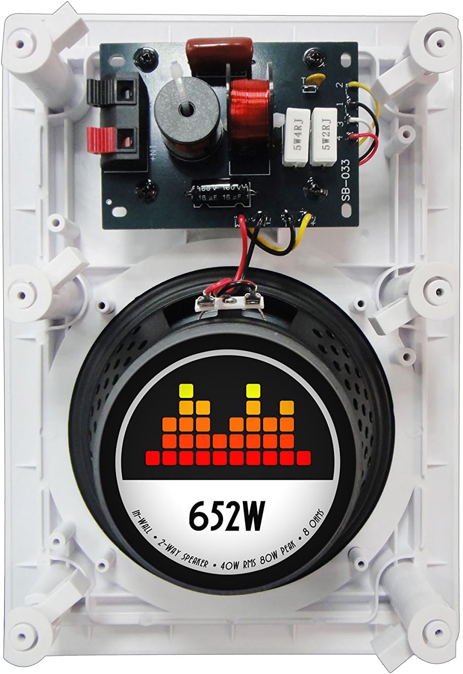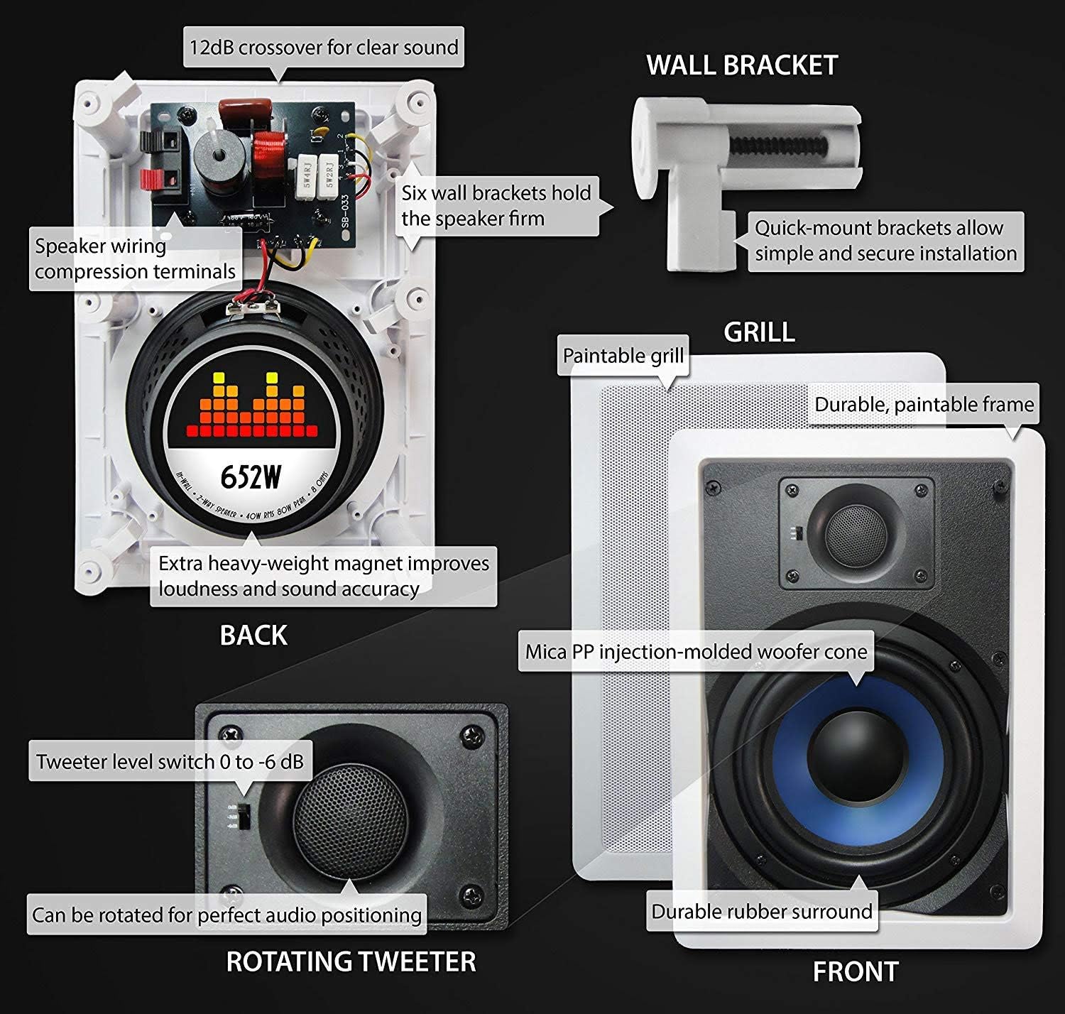 One speaker 2-way in-wall with a 6.5″ mica polypropylene cone woofer with rubber edge and a 16.5oz magnet delivers clear, distortion-free sound