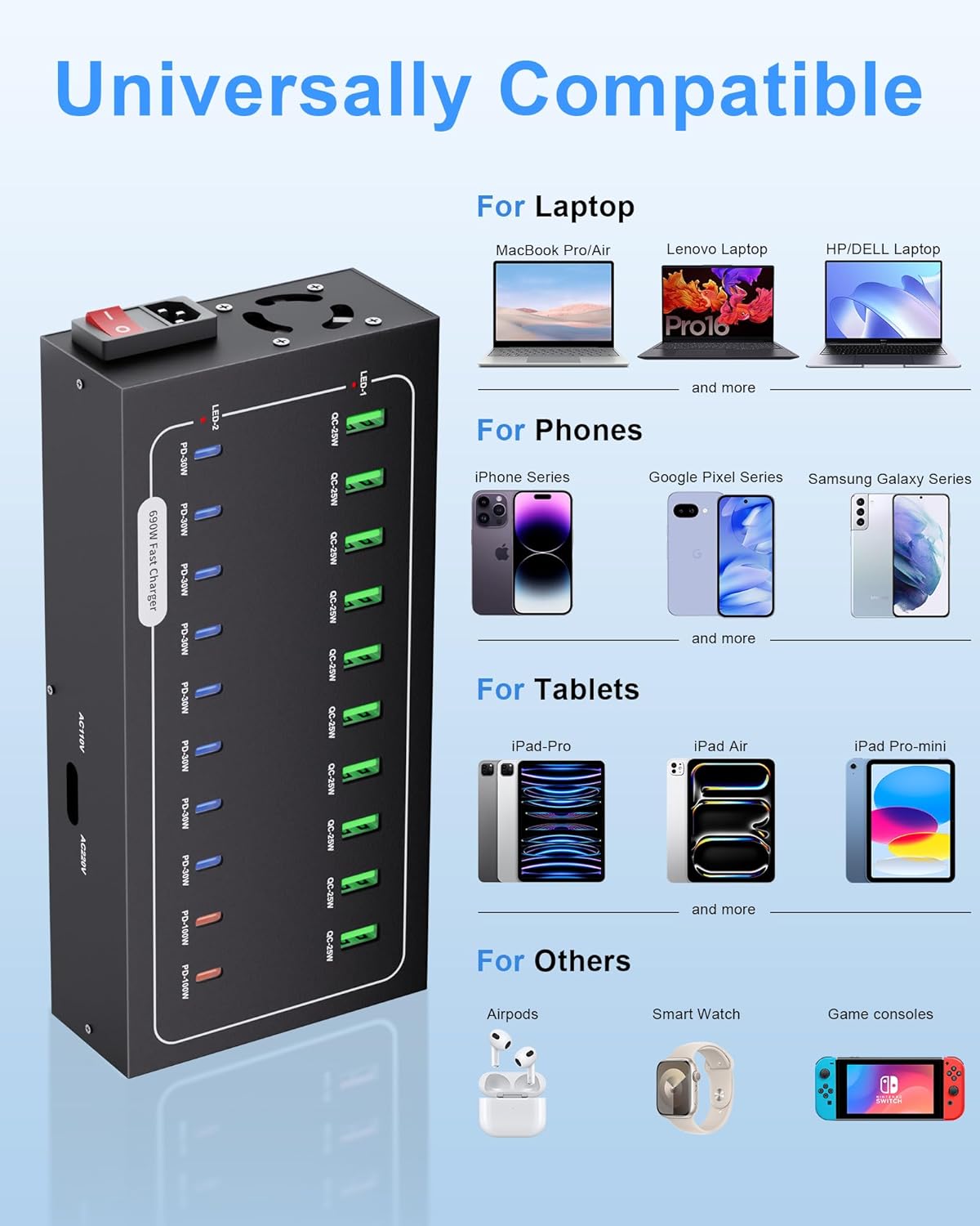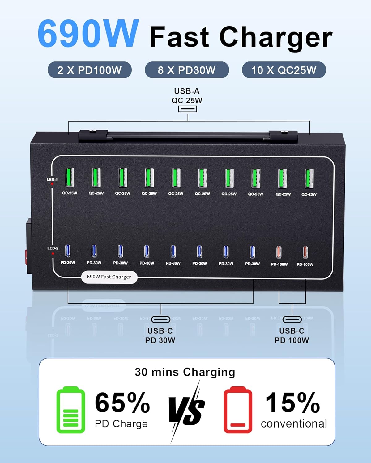 Specification: 690W USB Charging Station, 20 Port Fast Charging Station for Multiple Devices, PD 100W USB C Charger Block, Smart Power Delivery & Multi Protection for Laptop MacBook iPhone, iPad, Tablet, and More