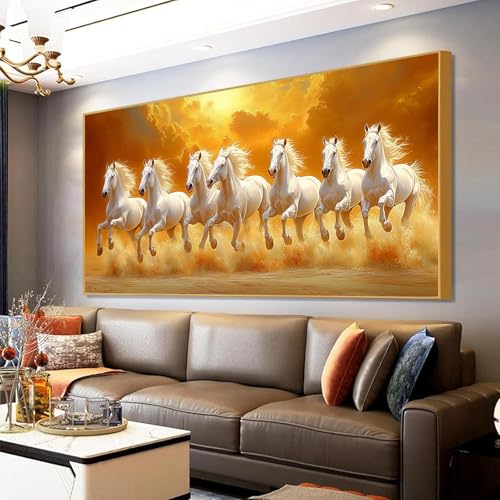 7 Running White Horses Canvas Wall Art, Horse Pictures Wall Decor, Horse Canvas Wall Art Large, Horse Themed Wall Decor (Gold Metal Framed, 70″x 35″| 180x90cm)