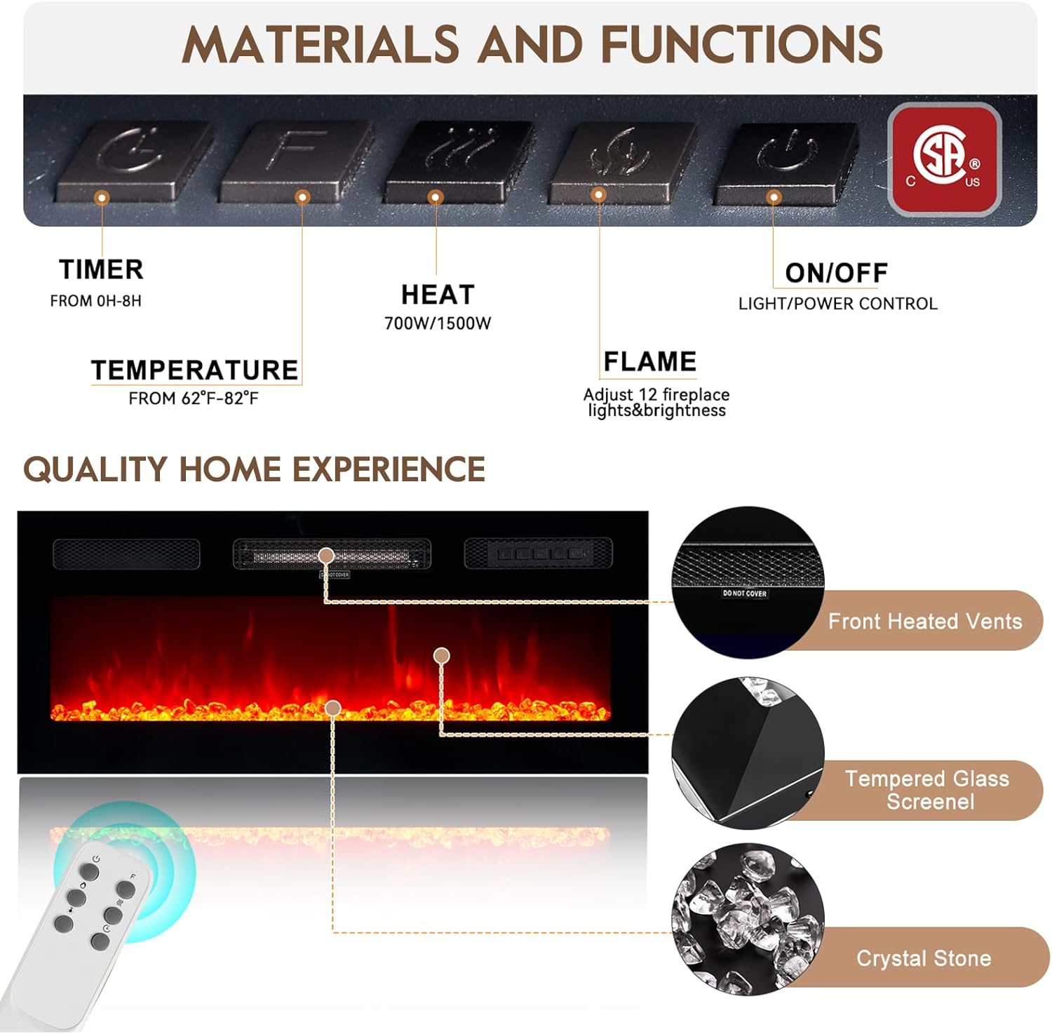 Safe & Energy-Efficient Fireplace: Adjustable temp range (62-82°F) with overheat protection & auto shut-off timer, CSA&ETL certified.