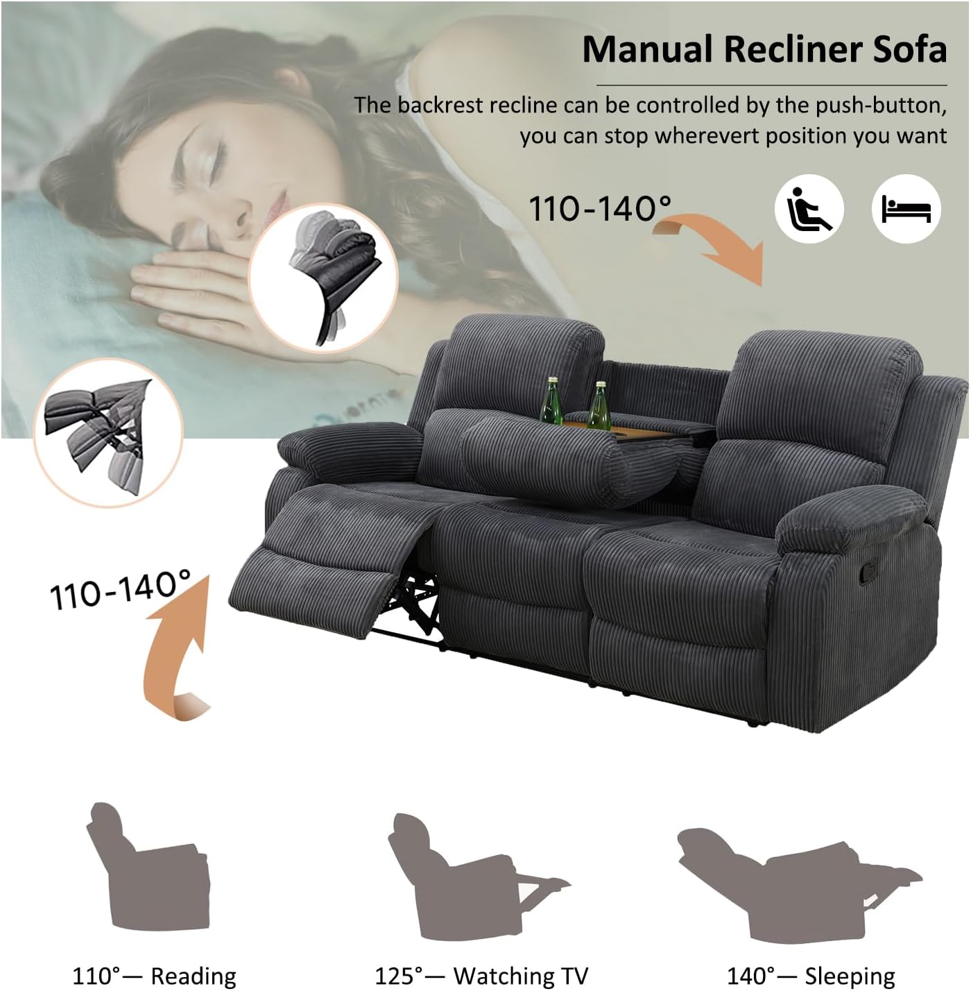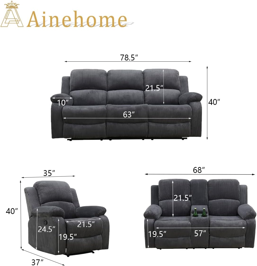 Specification: A Ainehome Living Room Furniture Set Recliner Sofa Set Loveseat Chair Furniture Sofa Set Grey Corduroy for Living Room/Rv/House/Theater Seating (A-Dark Grey Corduroy, 3 Piece Set)