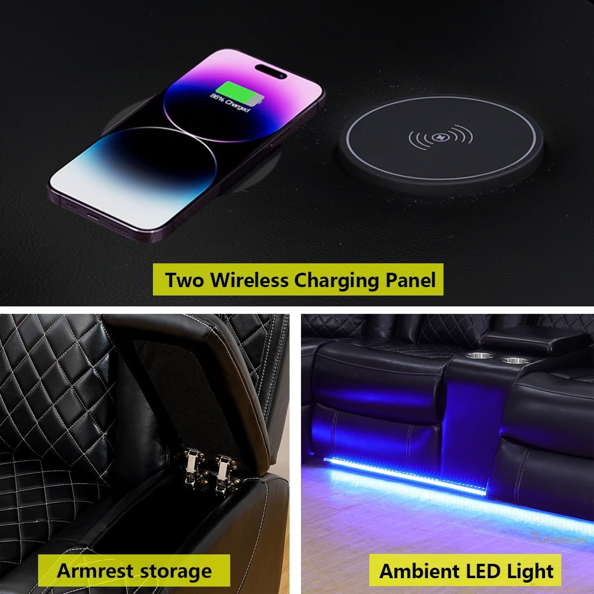 Functional design: Our sofa is equipped with USB charging port and charging set, so you can easily charge your mobile phone and other devices at any time; Our sofas are also equipped with LED lighting for use while reading or working; Dual cup holders allow you to free your hands without holding your drink; Each armrest has an open storage space, which can be used to store small items such as books and snacks, effectively improving the efficiency of space utilization.