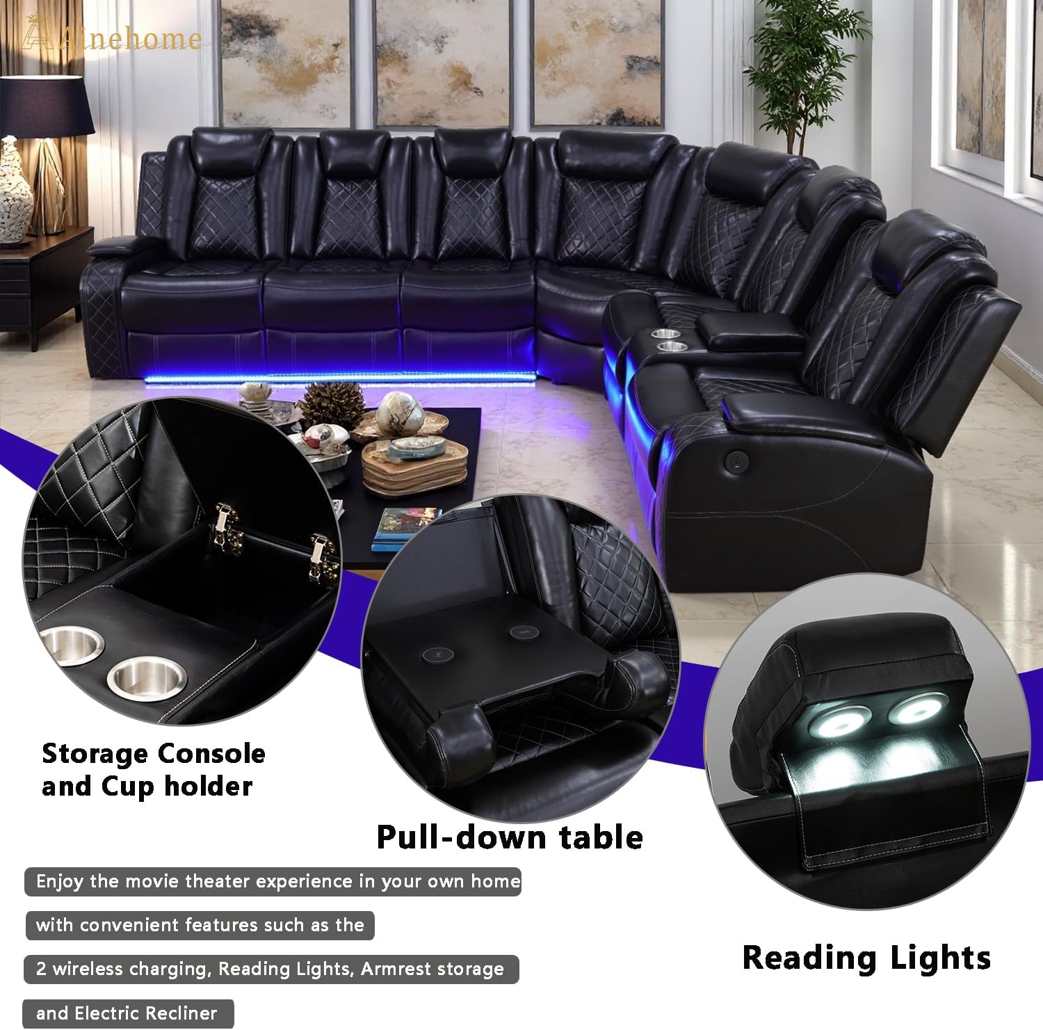 A Ainehome Power Recliner Sectional Sofa, Living Room Furniture Sets, Leather Power Reclining Sofa Set, Sectional Reclining Couch with LED/Storage Console for Living Room/Office(A-Black)